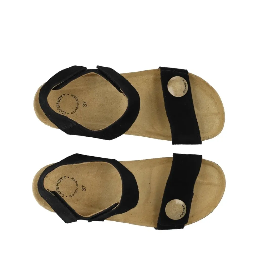 Cashott Casmette sandal til dame i sort. Træd let og stilfuldt ind i sommeren med vores Casmette sandal med kort kilehæl, skabt til mode- og komfortbevidste kvinder. Denne elegante sandal med ca. 5 cm. hæl kombinerer stil med ekstraordinær støtte takket være dens innovative funktioner. Med en letvægts EVA-ydersål og en blød kork- og latexsål former den sig efter din fod for en behagelig gang hele dagen. Hælstroppen tilføjer ekstra stabilitet, mens ruskindet fra LWG-certificerede garverier sikrer både luksus og bæredygtighed. Justerbare velcrobånd giver den perfekte pasform, og hver sandal er håndlavet i Spanien af dygtige håndværkere.