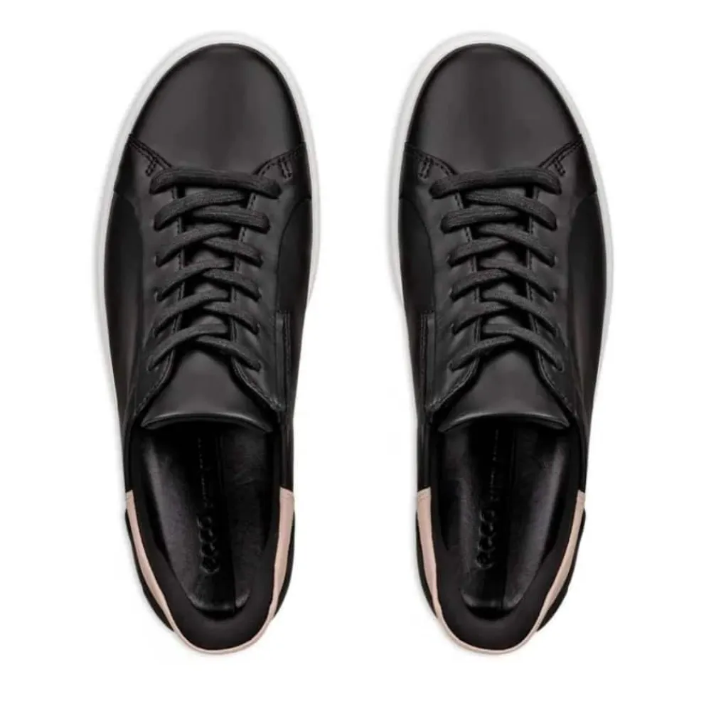 Ecco Soft 7 Easy Slip Lace sneakers til dame i sort. Disse moderne sneakers i klassisk sort med en elegant lyserød detalje på hælen balancerer perfekt mellem stil og komfort. Overdelen i glatskind giver et tidløst og eksklusivt udtryk, mens slip-in funktionen med fast hælkap gør skoen nem at tage på og af. Snørebåndene gør det muligt at justere pasformen, så den sidder helt rigtigt. Med den ekstra brede pasform får dine fødder masser af plads og komfort hele dagen. Indersiden er udstyret med en blød Ecco Fluidform™ indersål af skind, der tilpasser sig fodens naturlige form for optimal støtte. For endnu større fleksibilitet kan indersålen nemt tages ud efter behov.