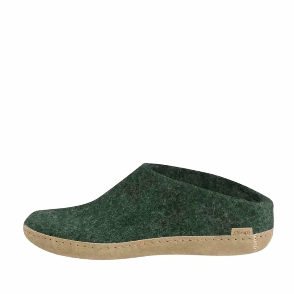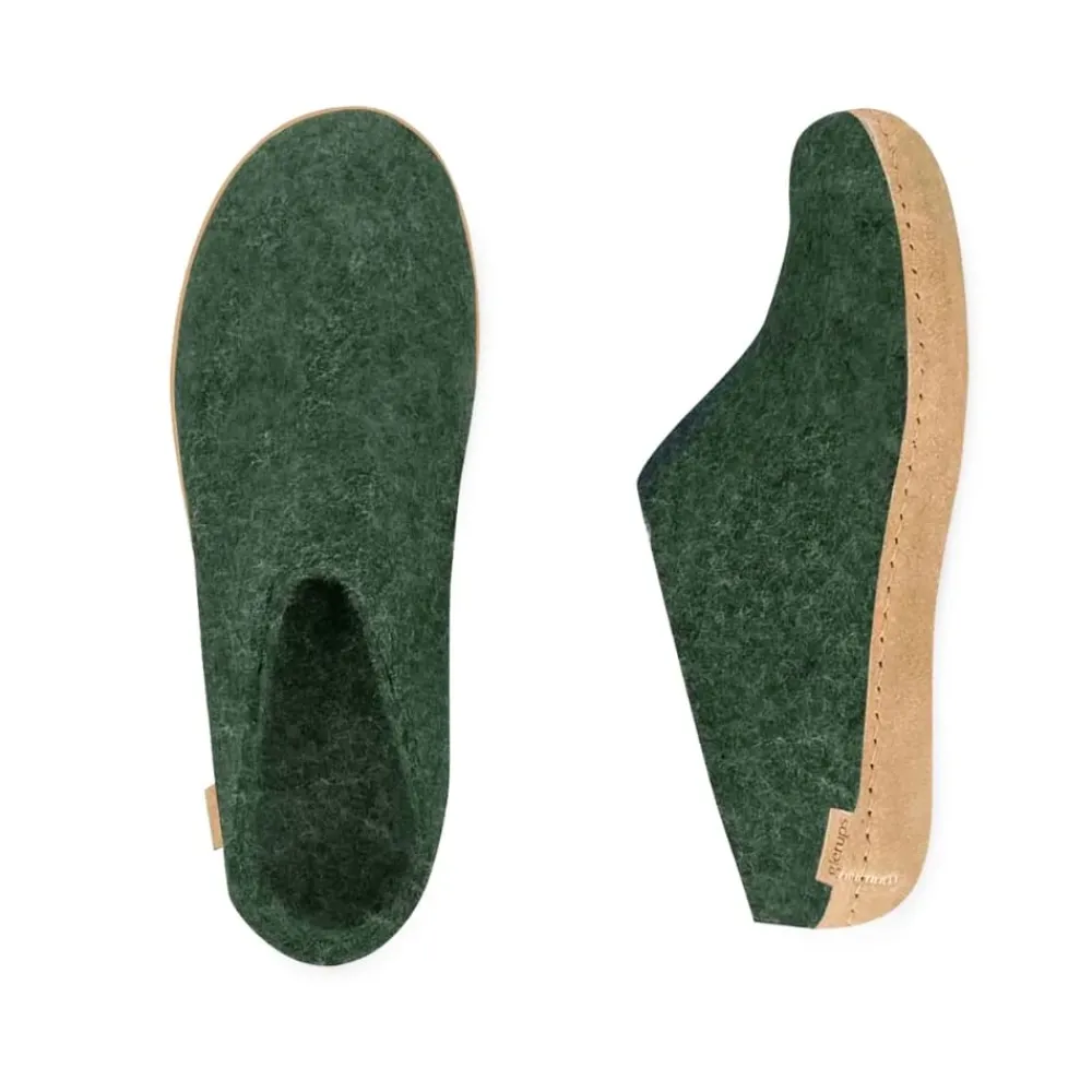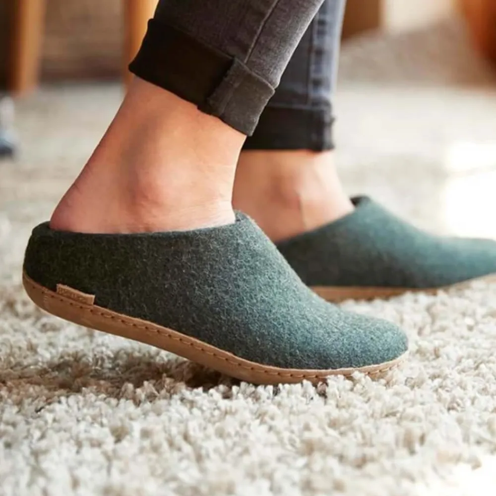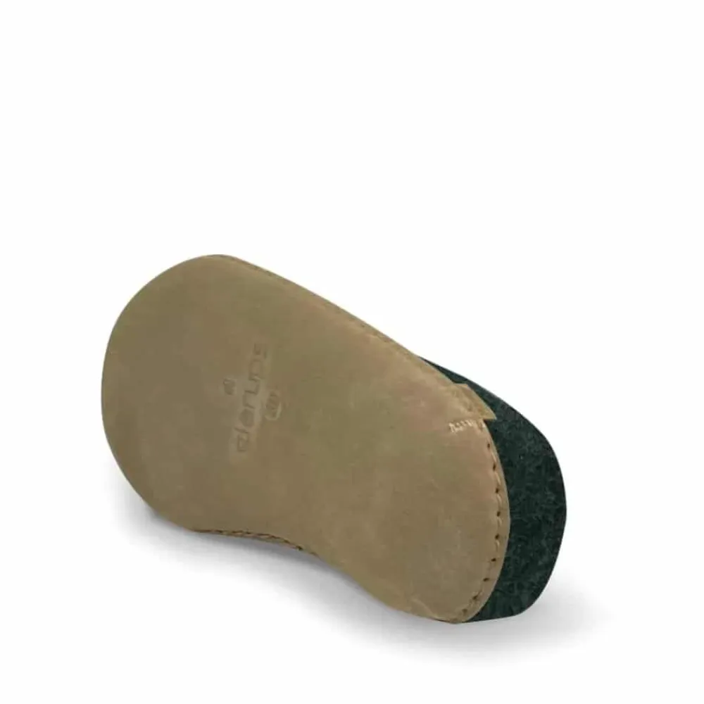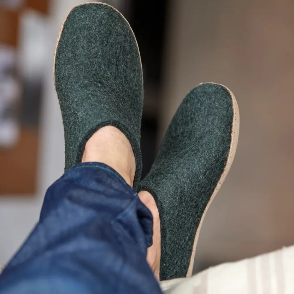 Glerups hjemmesko i grøn til dame og herre. Disse klassiske hjemmesko i grøn filt, håndlavet af 100% ren naturlig uld, tilbyder både komfort og stil. Med en sål af semi-vegetabilsk garvet kalveskind kombinerer de holdbarhed og fleksibilitet, hvilket gør dem utroligt behagelige og lette at tage på. Uldens naturlige fugtabsorberende egenskaber sørger for, at dine fødder forbliver varme og tørre hele dagen, uanset hvor du befinder dig.