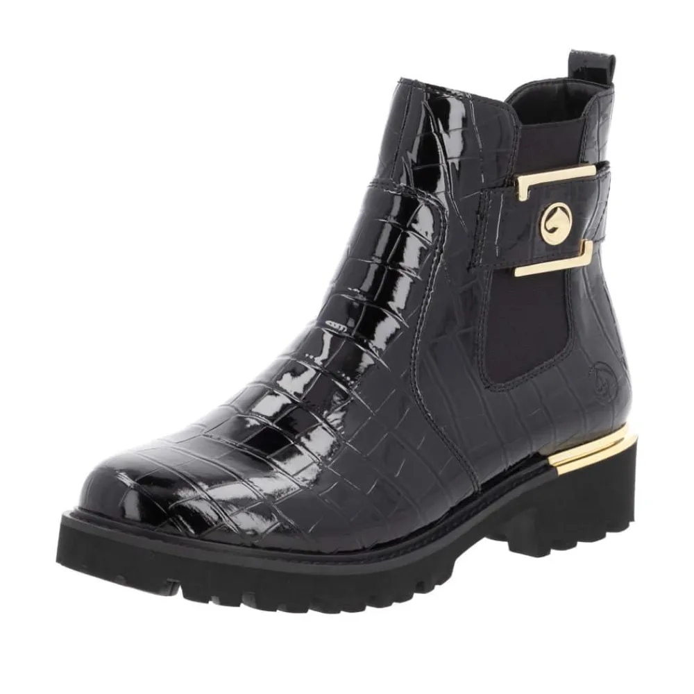 Remonte støvle til dame i sort. Denne super moderne støvle i en elegant sort farve med krokodillemønster og lak finish giver et ekstra sofistikeret touch. Støvlen er smukt dekoreret med gulddetaljer på siden og bag hælen. Indvendigt bliver du mødt af en let foring og en blød indersål, der kan tages ud efter behov. Med den praktiske lynlås på indersiden og elastikken på ydersiden er det nemt og hurtigt at tage støvlen af og på. Den robuste chunky sål med et godt mønster giver øget støtte og skridsikkerhed.