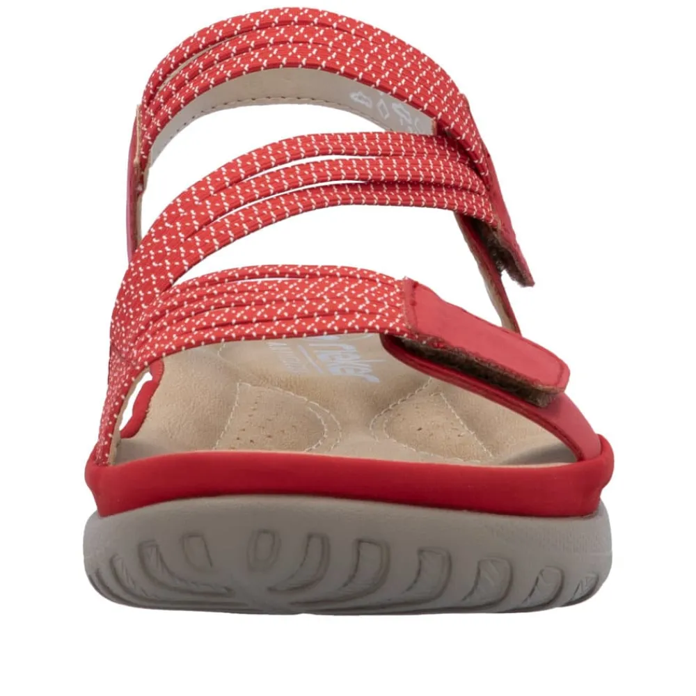 Rieker sandal i rød til dame. Rieker vandre-sandalen i rød er det perfekte valg til en aktiv hverdag. Den bløde sål og den fleksible EVA-sål sørger for god komfort hele dagen, mens de justerbare velcrolukninger og elastikken over vristen sikrer en nem og præcis pasform. Den lette og skridsikre sål gør sandalen perfekt til både lange gåture og afslappende stunder.