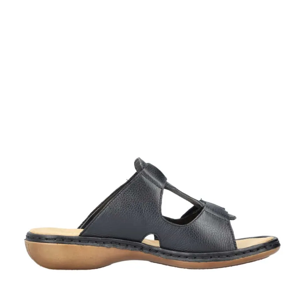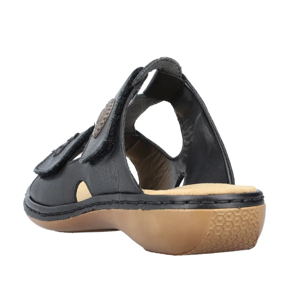 Rieker sandal til dame i sort. Disse klassiske sorte sandaler udstråler en tidløs elegance, der gør dem velegnede til både hverdagsbrug og særlige anledninger. Takket være de praktiske velcrobånd på forfoden og vristen kan du nemt tilpasse pasformen, hvilket sikrer en sikker og behagelig følelse. De stødabsorberende såler sørger for øget komfort for hvert skridt, du tager. Med en overdel i læder og bløde indlæg får du en sandal af højeste kvalitet!