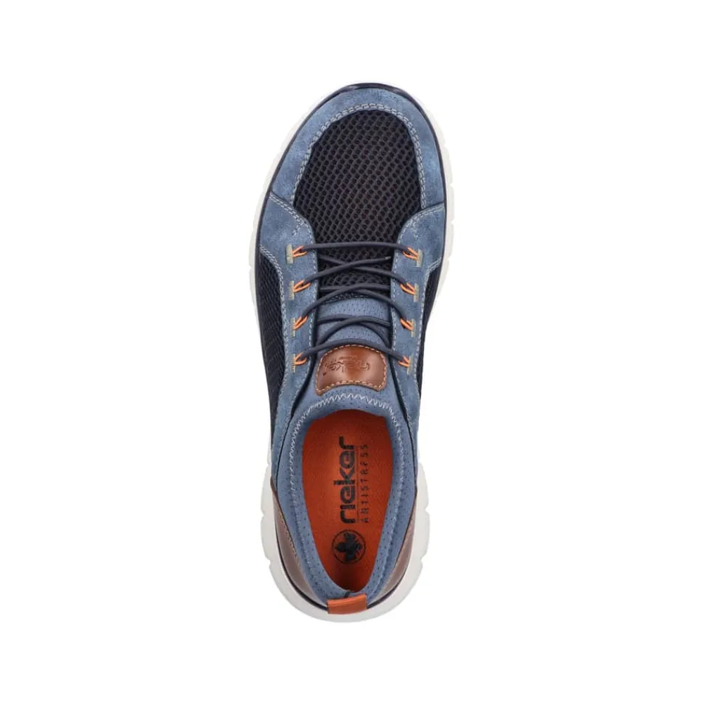Rieker sneakers til herre i blå. Stilfulde blå sneakers med flotte detaljer, der giver et moderne udtryk. Skoen er fremstillet i bløde materialer og har små perforeringer, som sikrer god åndbarhed. Med elastik er det let at tage skoen af og på, samtidig med at den tilpasser sig foden for en behagelig pasform. Indvendigt sørger en blød indersål for komfort hele dagen, mens den ekstra bredde G giver god rummelighed. Den lette og fleksible sål har stødabsorberende egenskaber og et solidt mønster, der giver støtte og skridsikkerhed
