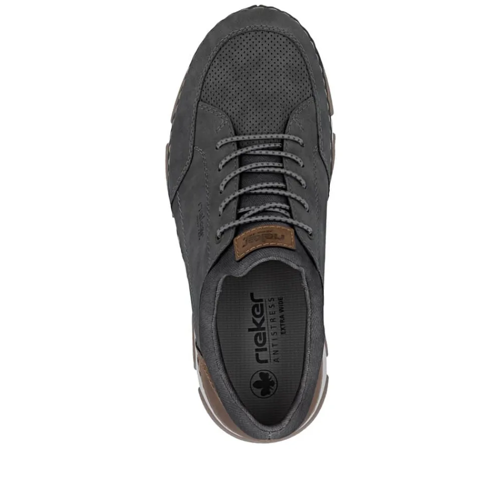 Rieker sneakers til herre i grå. Moderne og lette sneakers i grå, designet med elastik over vristen, som giver en behagelig pasform og gør skoen nem at komme i og af. Indvendigt er skoen udstyret med en blød udtagelig sål, mens ekstra bredde (H) sikrer god rummelighed til foden. Ydersålen har et mønster, som giver øget stødabsorbering og skridsikkerhed i hverdagen.