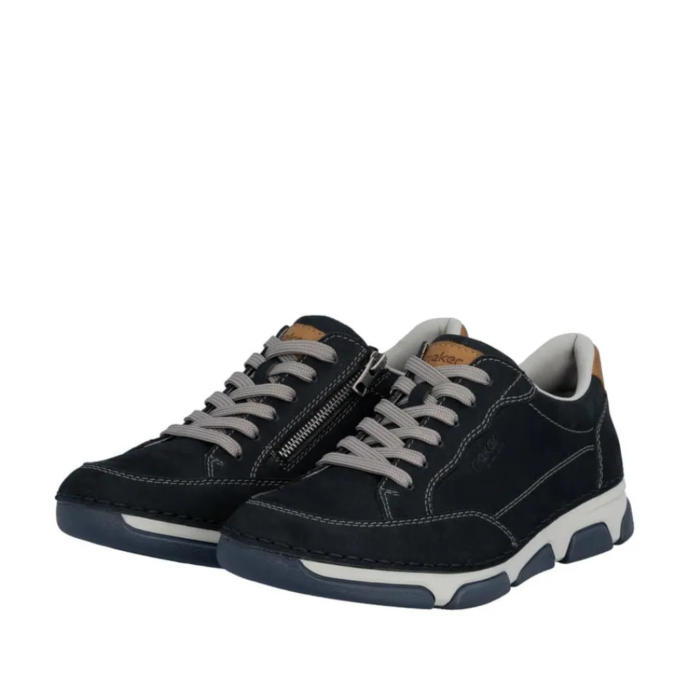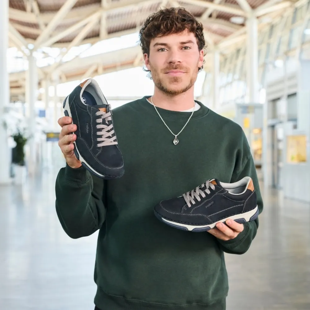 Rieker sneakers til herre i mørkeblå. Flotte og elegante sko med skindoverdel og fine detaljer, der giver et stilfuldt udtryk til både hverdag og pænere brug. Skoen har både snørebånd og en funktionel lynlås, som gør det let at komme i og af og samtidig giver mulighed for at justere pasformen. Indvendigt er skoen udstyret med en blød og udtagelig sål samt ekstra bredde (H), der sikrer høj komfort hele dagen. Ydersålen er designet med et mønster, som giver øget støtte og skridsikkerhed i hvert skridt.
