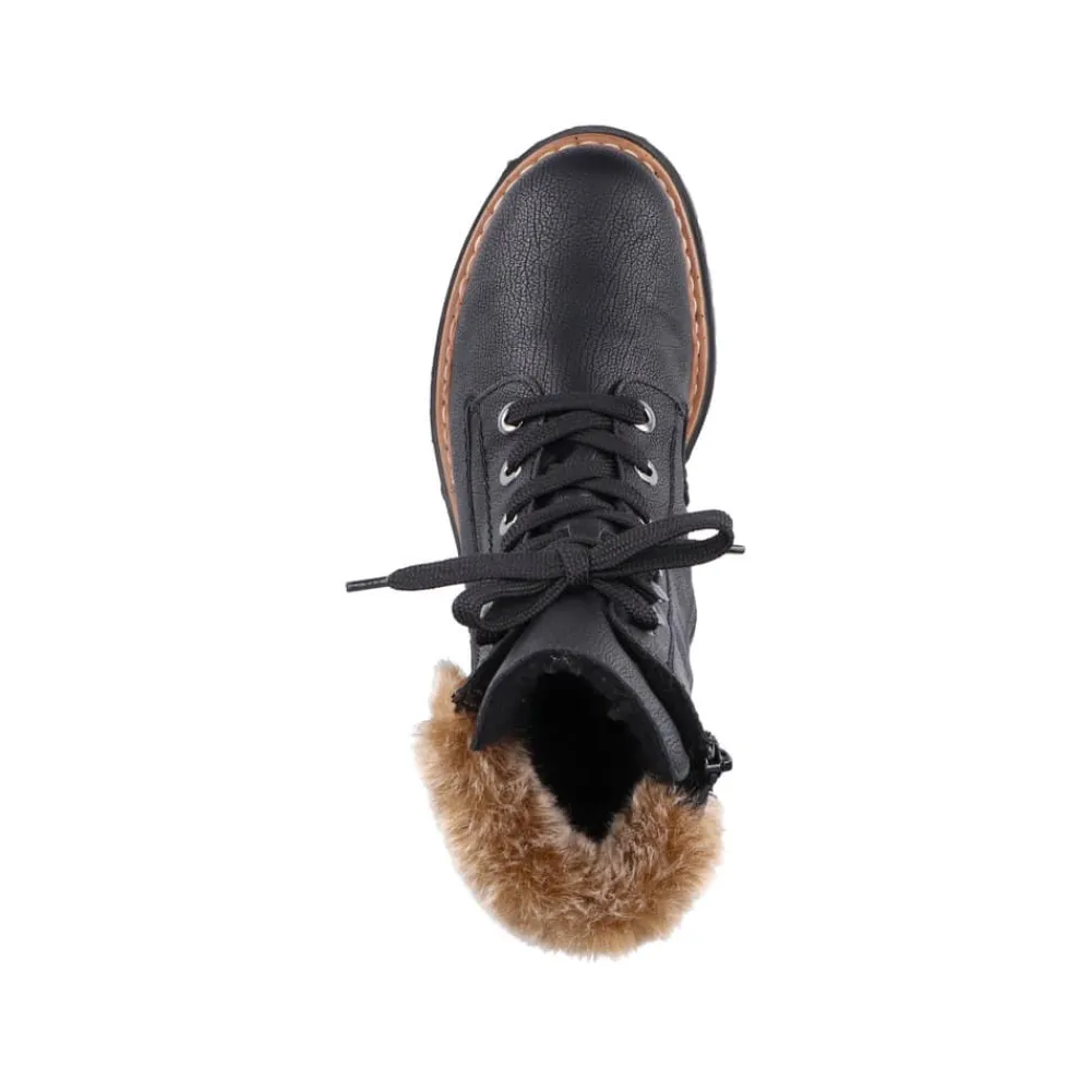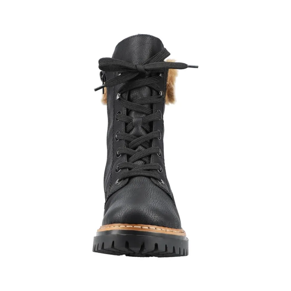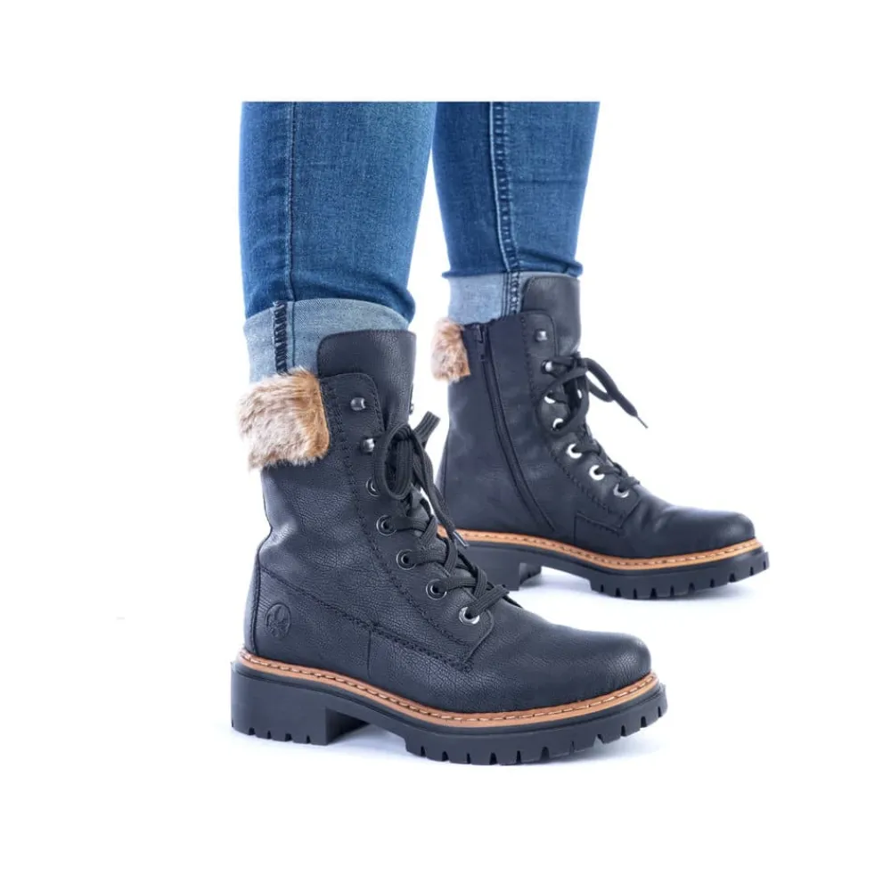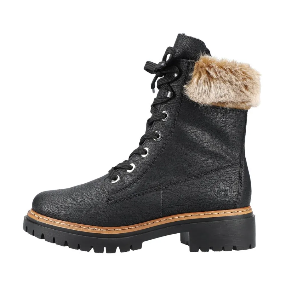 Rieker vinterstøvle til dame i sort. Disse sorte vinterstøvler giver både stil og komfort. De er lavet med en særlig teknik, der gør dem ekstra holdbare og fleksible. Snørebåndene og lynlåsen sikrer en god pasform og støtte. En flot skaftkrave med pels tilføjer et moderne look. Den lette sål og blokhælen giver stødabsorbering ved hvert skridt, mens den bløde indersål gør dem ekstra behagelige. Den varme foring holder dine fødder varme hele dagen, selv i kolde temperaturer.