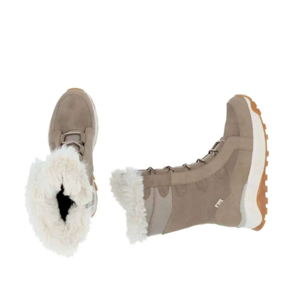 Rieker støvle til dame i beige. Moderne beige støvle i ruskind med smarte detaljer, der giver et stilrent og feminint udtryk. Støvlen har snørebånd foran og en funktionel lynlås på indersiden, som gør den nem at tage på. Indvendigt sørger en blød, udtagelig indersål og en varm uldforing for høj komfort og lune fødder. Takket være Rieker-Tex er støvlen kraftigt vandafvisende, mens den stødabsorberende ydersål med mønster giver bedre støtte og skridsikkerhed.