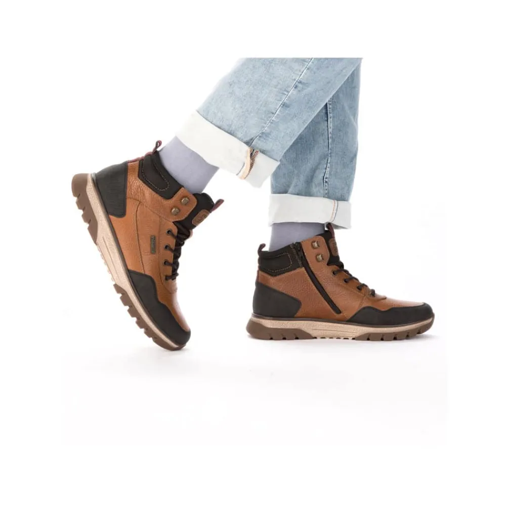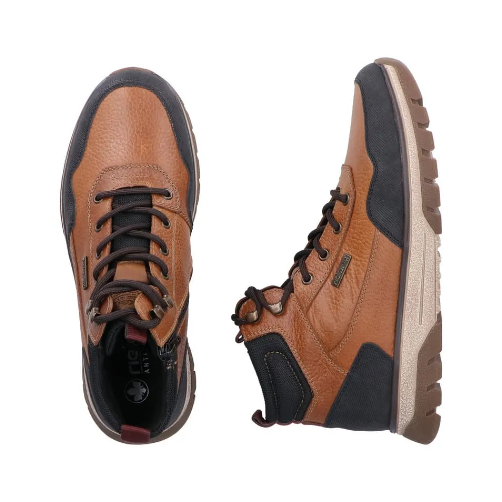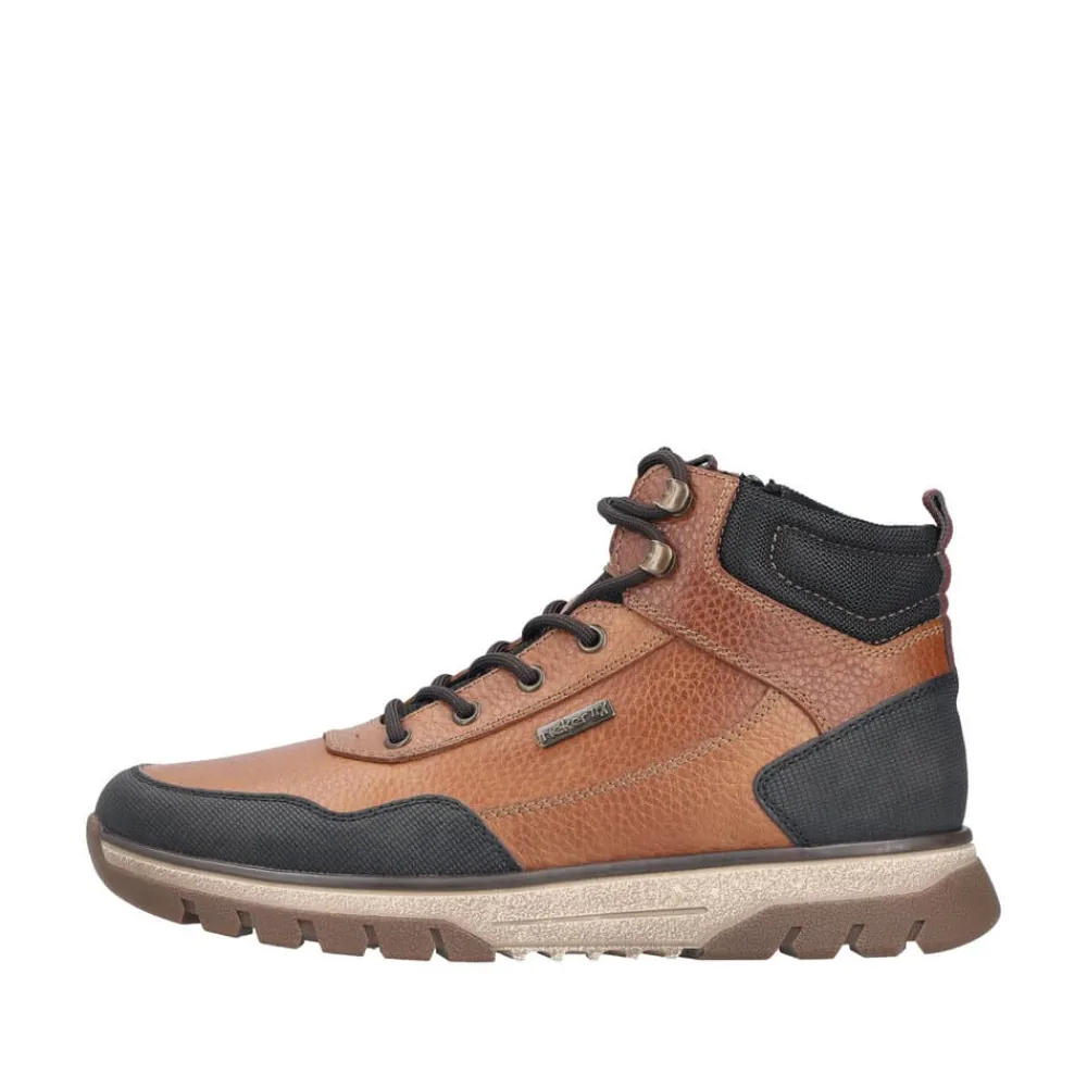 Rieker støvle til herre i brun. Stil og komfort går hånd i hånd med denne praktiske skindstøvle. Modellen er designet med både snørebånd og lynlås, så støvlen er let at tage på og samtidig kan du tilpasse pasformen. Indvendigt finder du en blød udtagelig sål og varm foring samt ekstra bredde (H), som giver en god komfort. Støvlen er udstyret med Rieker-Tex der gør modellen kraftig vandafvisende, mens den mønstrede ydersål giver øget stødabsorbering og skridsikkerhed.