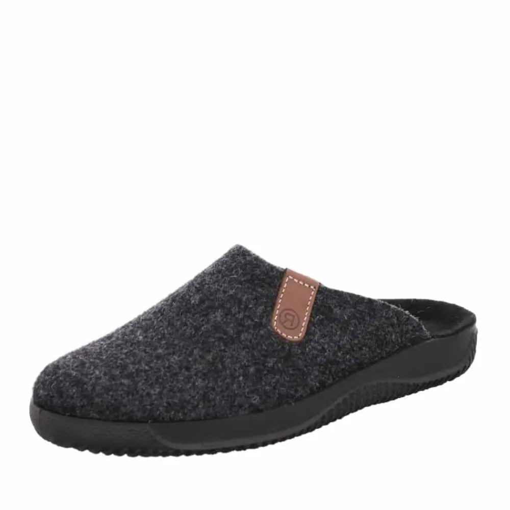 Rohde hjemmesko til herre i grå. Dejlig hjemmesko til herre i en flot mørkegrå farve med en fin Rohde detalje på siden. Hjemmeskoen er lavet i noget lækkert filt materiale, der giver en behagelig og lun fornemmelse dagen lang. Med en god og solid ydersål der er udstyret med et godt mønster under sålen, kan du også bruge hjemmeskoen udenfor.