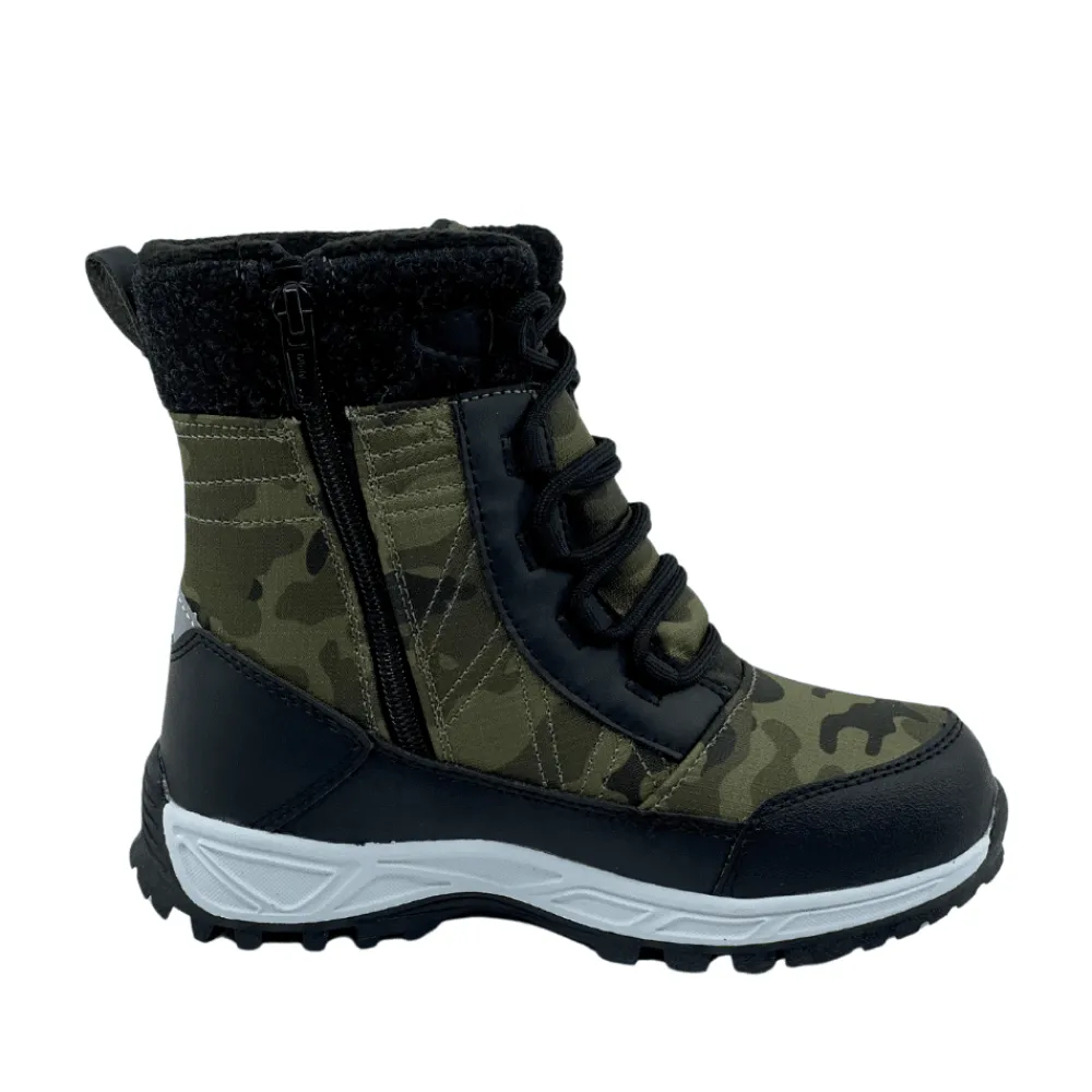 Kompis støvle i camoflage farve til børn. Super lækker varmforet støvle fra Kompis, i en smart camoflage farve med fine detaljer. Modellen har funktionel lynlås på indersiden, samt justerbar snøre foran som gør det nemt for børnene, selv at kunne få den af og på. Endnu en fordel ved denne støvle er at den er vandtæt og har udtagelige såler.