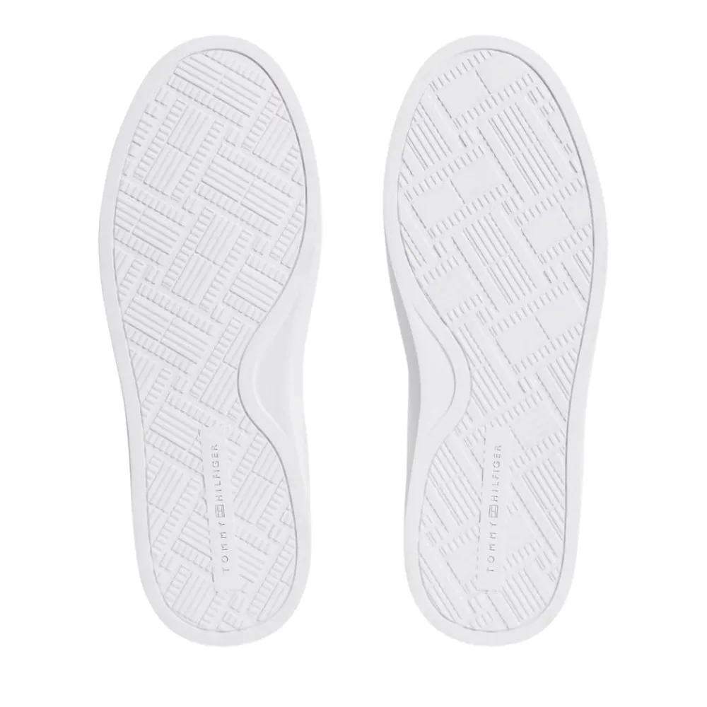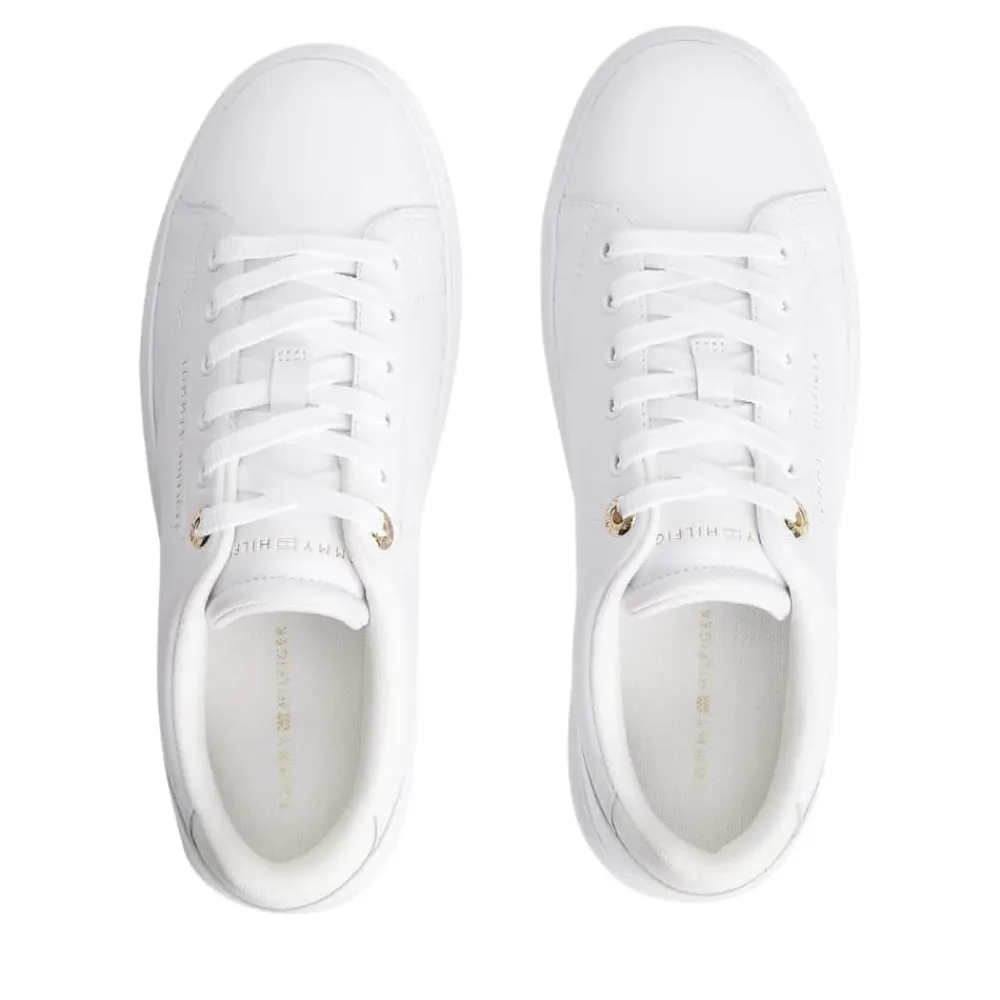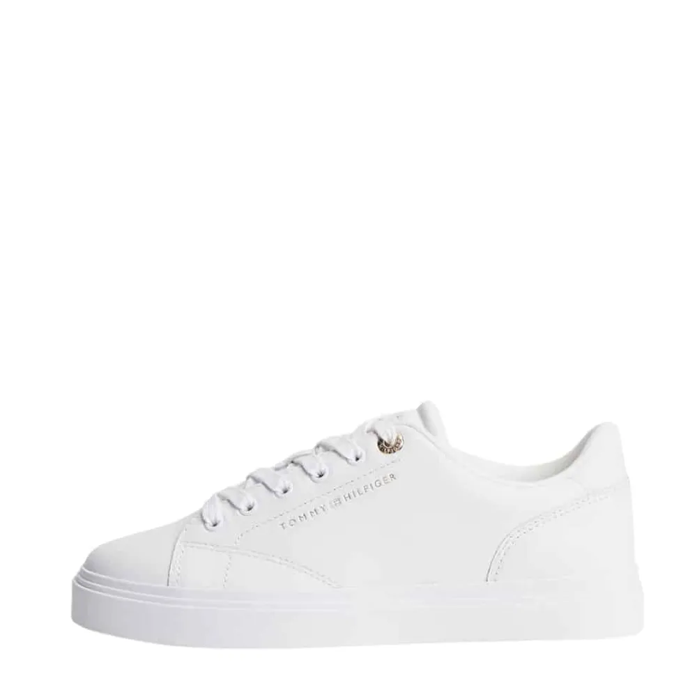 Tommy Hilfiger Feminine Cupsole sneakers til dame i hvid. Klassisk sneakers i hvid med enkle gyldne detaljer, der giver et moderne og stilrent udtryk. Skoen har en blød overdel i ægte skind, som føles behagelig på foden, og snørebånd foran gør det nemt at justere pasformen. Indvendigt bliver du mødt af en blød og udtagelig indersål, der giver god komfort dagen igennem. Den solide ydersål bidrager med stabil støtte, så skoen er velegnet til hverdagsbrug.