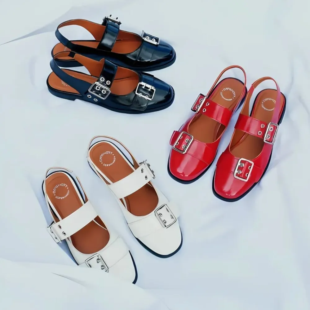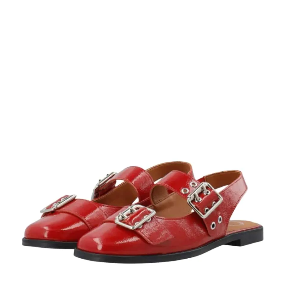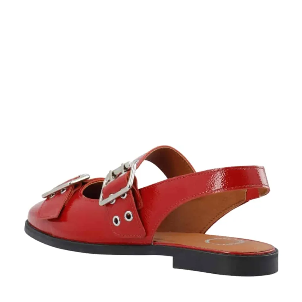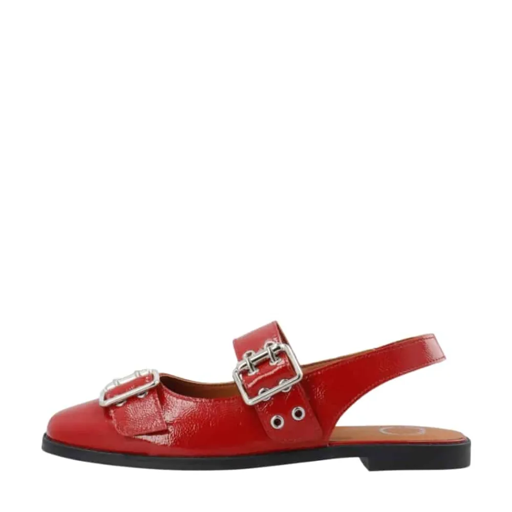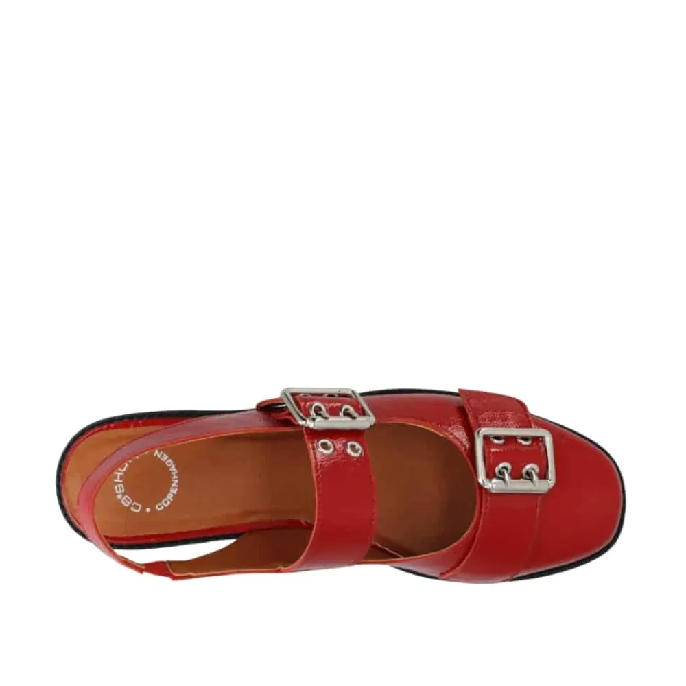 Cashott Casdiana Mary Jane ballerinasko til dame i rød. Denne røde ballerinasko forener elegance og komfort på perfekt vis. Den er fremstillet af 100% blødt patentlæder, som sikrer en behagelig pasform hele dagen. Den blanke lakoverflade og de trendy, justerbare sølvspænder giver et moderne og råt udtryk, der nemt kan styles til ethvert outfit. Skoen er designet med en gummisål og en diskret 1,5 cm hæl, der giver let støtte uden at gå på kompromis med komforten. Indvendigt sørger en åndbar og miljøvenlig mikroforing for et sundt fodklima. Med sin runde snude og skinnende røde patentlæder er denne ballerina både stilfuld og praktisk – et must-have i garderoben.