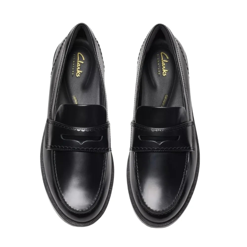 Clarks Straven Edge loafers til dame i sort. Stilrene loafers i sort med et enkelt design og elegante detaljer, der tilfører et moderne udtryk. Overdelen er lavet af blødt læder med unikke bølgede detaljer, der giver skoen karakter. Indvendigt finder du en Contour Cushion indersål med målrettet skum, som sikrer komfort hele dagen. Den lille hæl på ca. 2 cm giver et elegant løft. Bemærk, at modellen er lille i størrelsen.