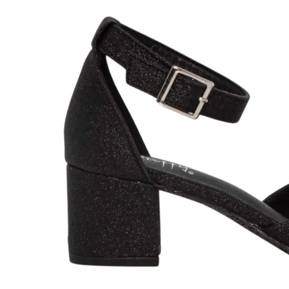 Duffy pumps til dame i sort glimmer. Tilføj lidt glimmer til din stil med vores klassiske pumps. De har en behagelig 5,5 cm blokhæl og en dækket tå med et strejf af glitter. Den justerbare ankelrem sikrer en god pasform, mens det bløde indlæg gør dem behagelige hele dagen. Perfekte til både hverdag og fest – et enkelt og elegant valg!