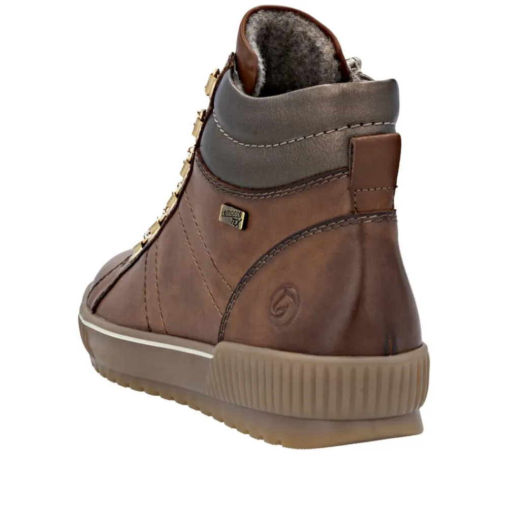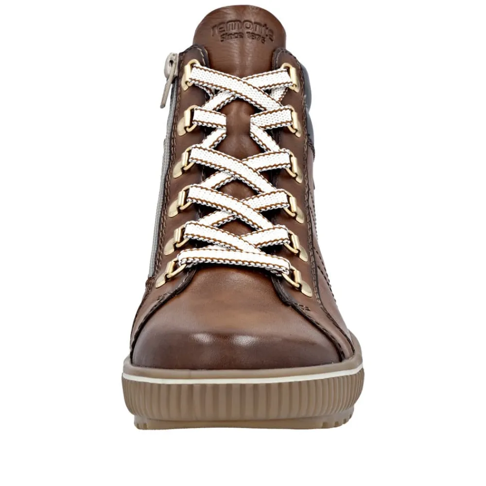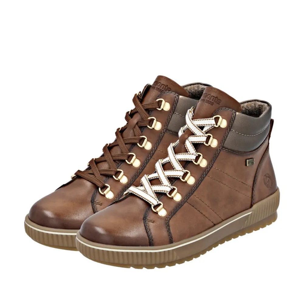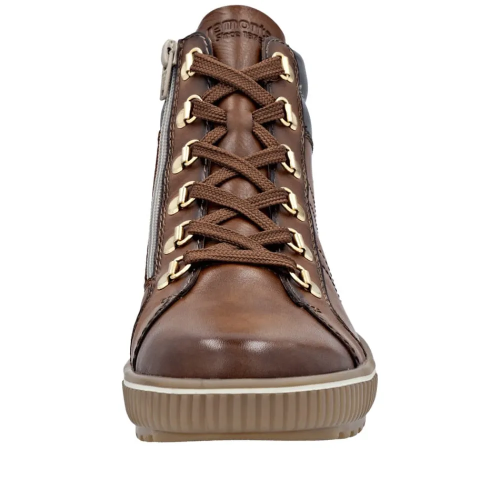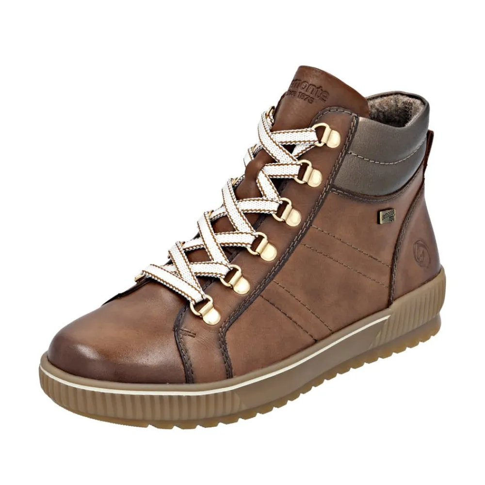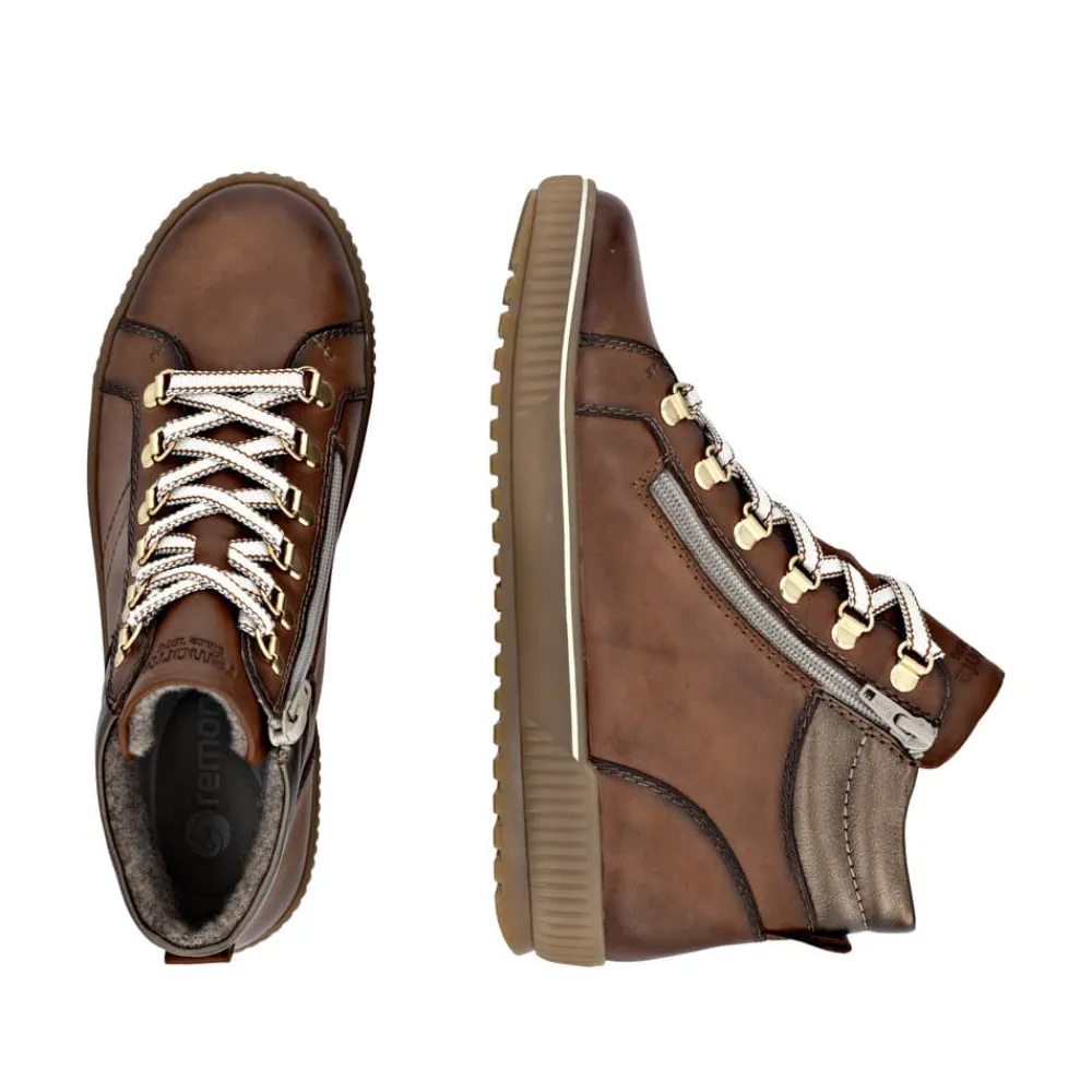 Remonte støvle til dame i brun. Denne brune støvle kombinerer stil og komfort på bedste vis. Overdelen er i skind, og med justerbare snørebånd som kan skiftes samt en praktisk lynlås på indersiden er den nem at tage af og på. Indvendigt finder du en blød og udtagelig Remonte Soft sål, der giver komfort hele dagen. Støvlen har ekstra bredde G, som sikrer god rummelighed og Remonte-Tex der gør den kraftig vandafvisende. Den solide ydersål med mønster giver øget skridsikkerhed, mens de stødabsorberende egenskaber bidrager til en behagelig gangoplevelse.