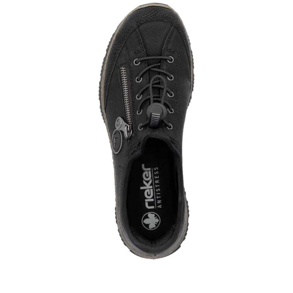 Rieker Ready 2 Go sneakers til dame i sort. Denne sneakers fra Rieker er designet med den innovative Hands Free Ready 2 Go teknologi, der gør det nemt og hurtigt at tage denne sneakers på uden brug af hænder med den faste hælkappe og en smart elastiklukning. Den lette, stødabsorberende sål sikrer dine fødder optimal komfort ved hvert skridt. Derudover giver den ekstra bløde Memosoft indersål en luksuriøs følelse. Designet i flotte og bløde materialer med en pynte lynlås på siden, så spares der hverken på stil eller komfort med denne sko. Tag skridtet og oplev den ultimative skooplevelse i dag med Rieker Ready 2 Go!
