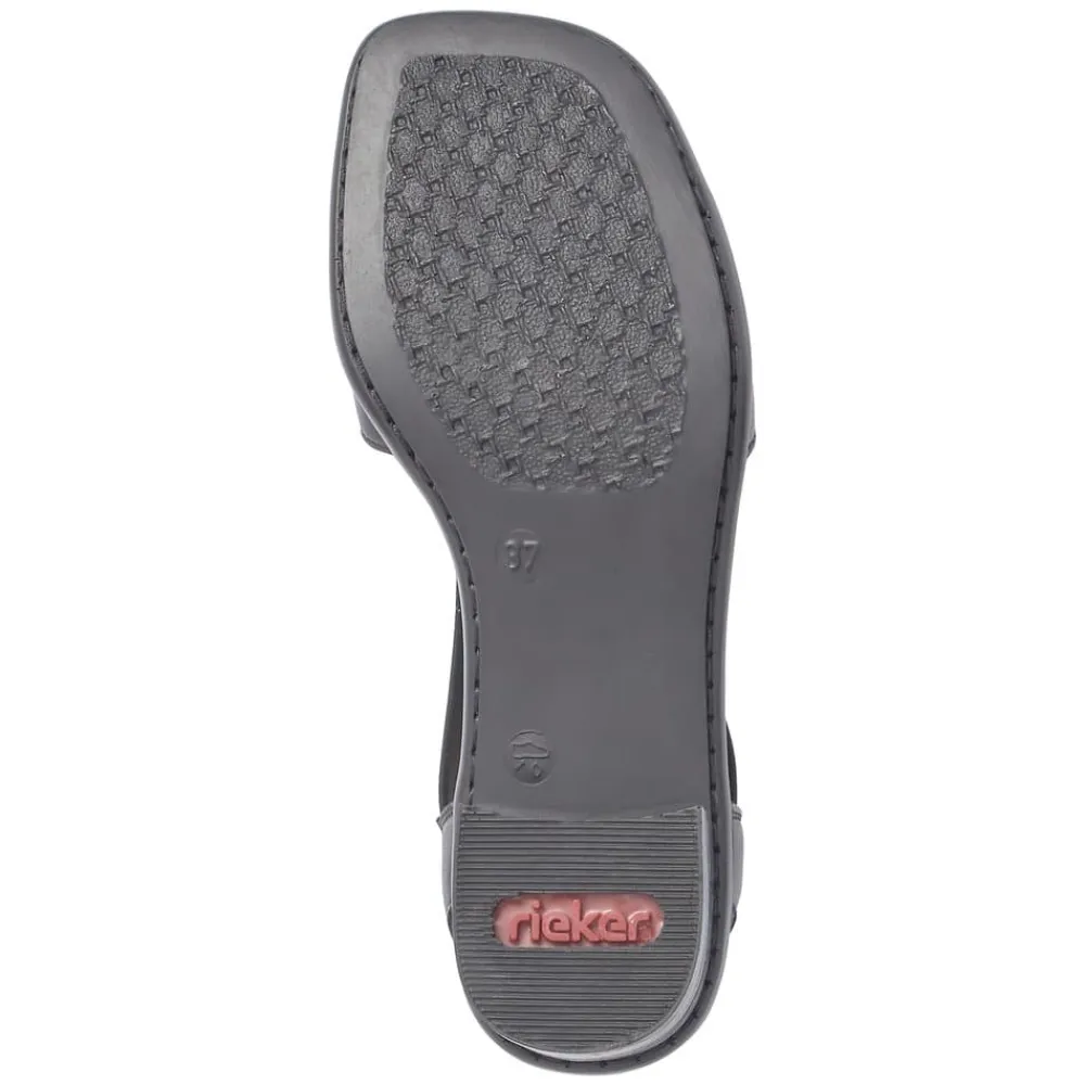 Rieker sandal i sort til dame. Disse sorte Rieker sandaler i glat læder er omhyggeligt håndværkede. Takket være elastikindsatsen er de nemme at tage af og på. Den midterste rem med et cirkulært smykkeelement tilføjer et ekstra touch af elegance. Med den stødabsorberende og lette sål vil dine fødder opleve optimal gåkomfort ved hvert skridt. Sandalen har en slank pasform (E 1/2), der giver god støtte til foden. Disse sandaler har 100% potentiale til at blive dine favoritter, med en behagelig ca. 4 cm blokhæl.