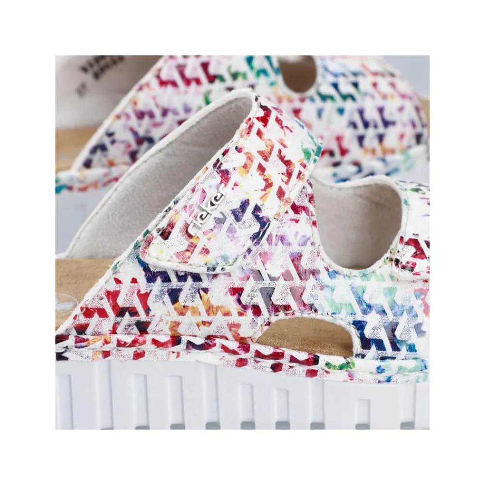 Rieker sandal til dame i hvid med farvekombination. Disse Rieker sandaler i flotte farver kombinerer smart design med velvære for fødderne. Den traditionelle forarbejdning gør dem fleksible og holdbare, og de justerbare velcroremme giver en pasform, der kan tilpasses individuelt. Den lette sål med kilehæl har stødabsorberende egenskaber, som gør sandalerne velegnede til både arbejde og fritid. Indersålen er ekstra blød, og den smalle pasform giver en sikker og behagelig støtte hele dagen.