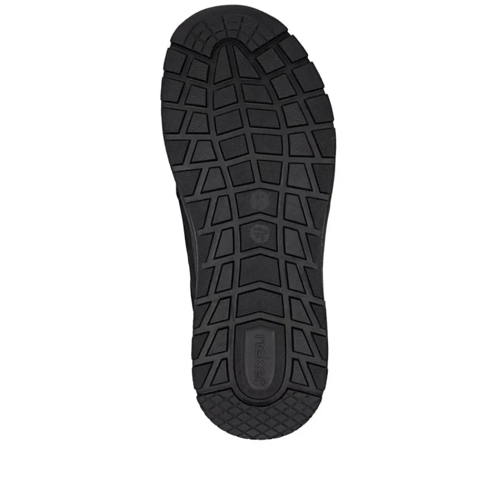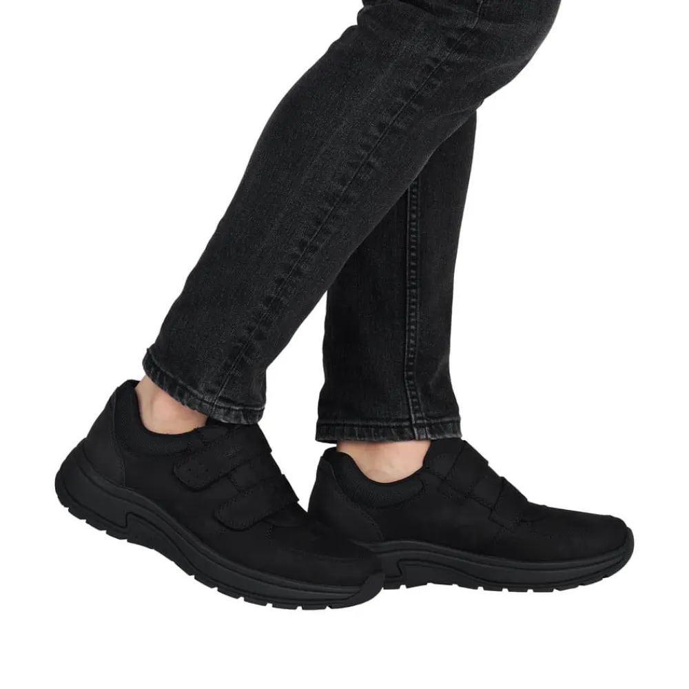 Rieker sko til herre i sort. Smarte herresko med en blød skindoverdel, der gør dem ideelle til hverdagsbrug. Modellen er udstyret med praktisk velcrolukning, så skoen er nem at tage af og på. Indvendigt finder du en blød udtagelig sål samt ekstra bredde (H), der giver både komfort og mere rummelighed til foden. Den mønstrede ydersål giver øget stødabsorberende og skridsikkerhed.
