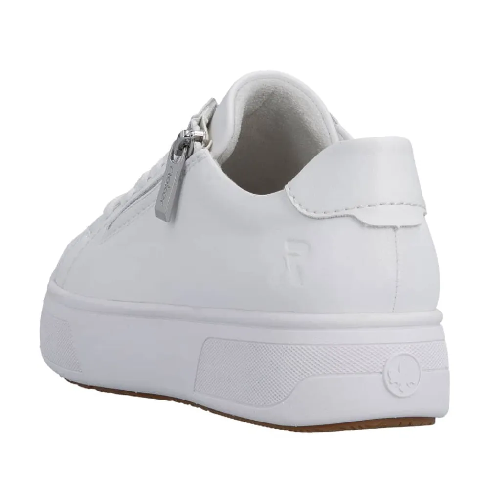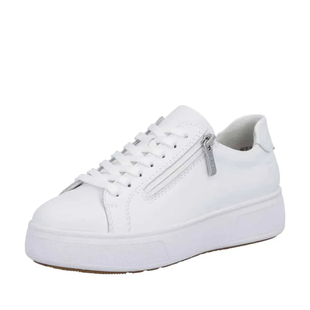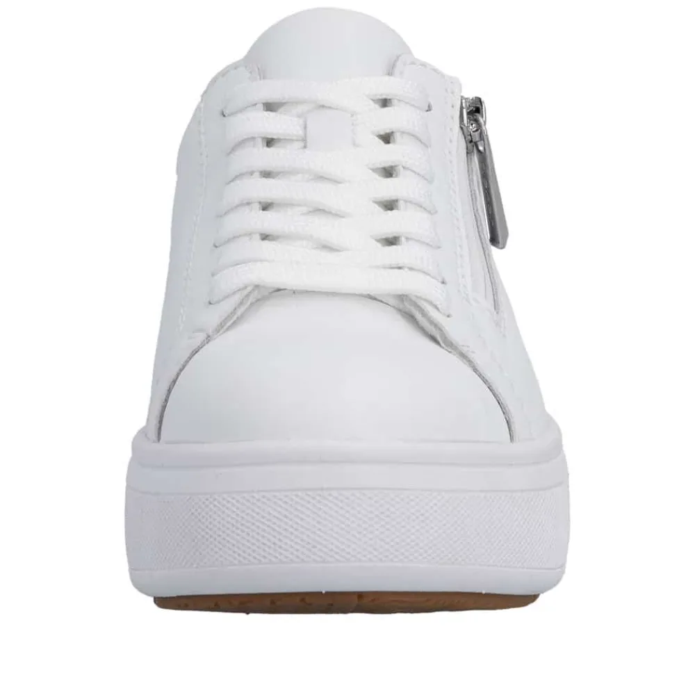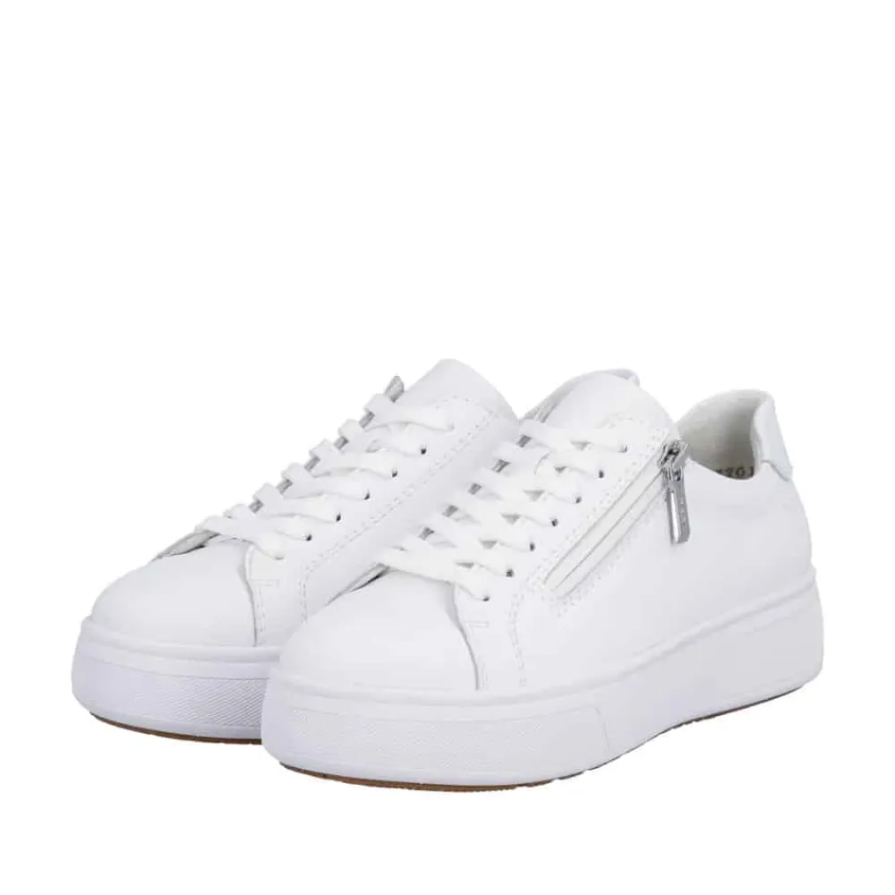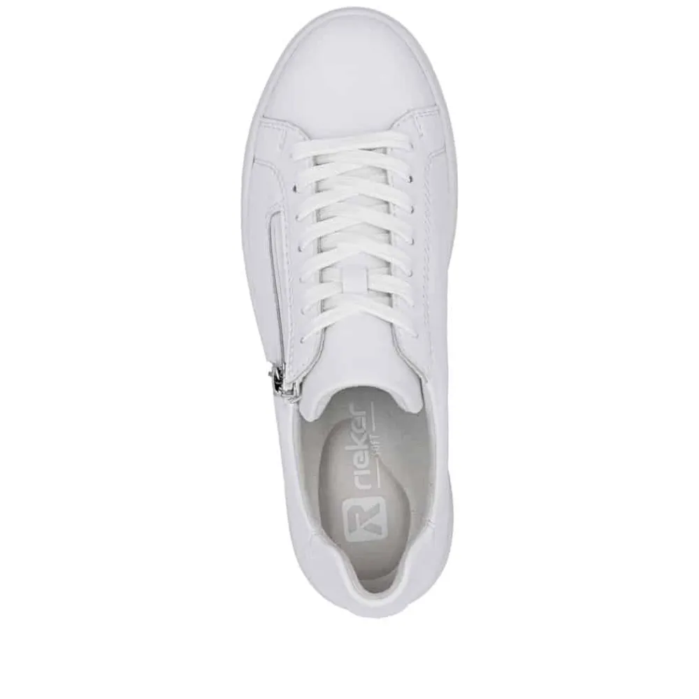 Rieker sneakers til dame i hvid. Stilfuld sneakers i hvid med et klassisk design og enkle detaljer. Kombinationen af snørebånd foran og en praktisk lynlås på ydersiden gør det let både at tilpasse pasformen og komme hurtigt i og af skoen. Indvendigt er skoen udstyret med en blød og udtagelig Rieker-Soft sål som giver behagelig komfort. Plateausålen på 4 cm. er designet med stødabsorbering, og ydersålen i gummi sikrer øget skridsikkerhed i hverdagen.