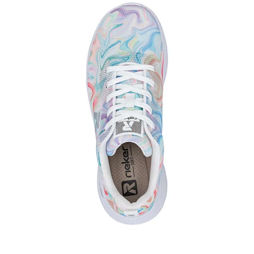 Rieker sneakers til dame i en flot farvekombination. Elegant sneakers med farverige detaljer der giver skoen ekstra strejf af stil. Skoen har snørebånd foran som gør det nemt at justere pasformen, og indvendigt mødes du af en blød og udtagelig Rieker-Soft så. Den lette og fleksible ydersål er designet med Rieker-Light+ og stødabsorbering for god komfort hele dagen.