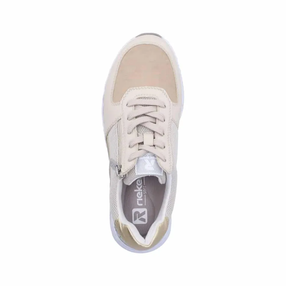 Rieker sneakers til dame i beige. Flotte sneakers med funktionelle detaljer, der gør dem ideelle til hverdagsbrug. Skoen har både snørebånd og en funktionel lynlås, som gør det nemt at komme i og af skoen. Indvendigt finder du en blød og udtagelig sål, mens ekstra bredde (H) giver god rummelighed og komfort til foden hele dagen. Den mønstrede ydersål giver øget stødabsorbering og skridsikkerhed dagen igennem.