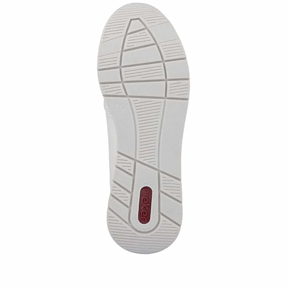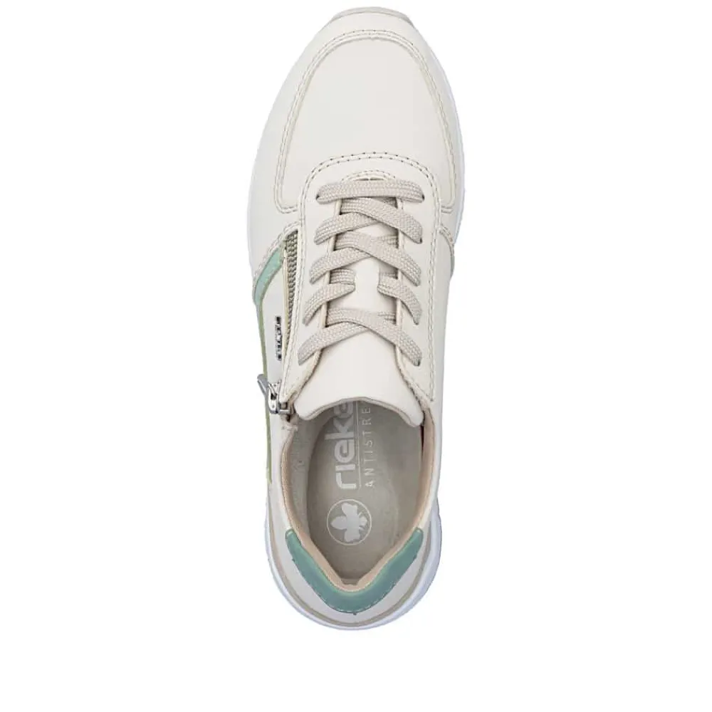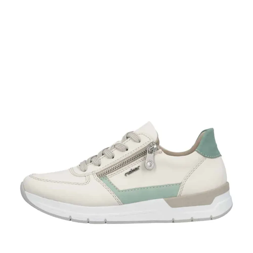 Rieker sneakers til dame i beige. Flot og moderne sko med grønne detaljer, der giver et friskt og stilfuldt udtryk. Skoen er udstyret med både snørebånd og en lynlås, som gør skoen nem at komme i og af. Indvendigt mødes du af en blød og udtagelig indersål, der giver behagelig komfort hele dagen. Den mønstrede ydersål giver øget stødabsorbering og skridsikkerhed i hvert skridt.