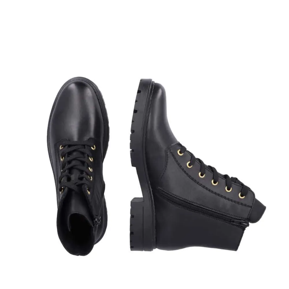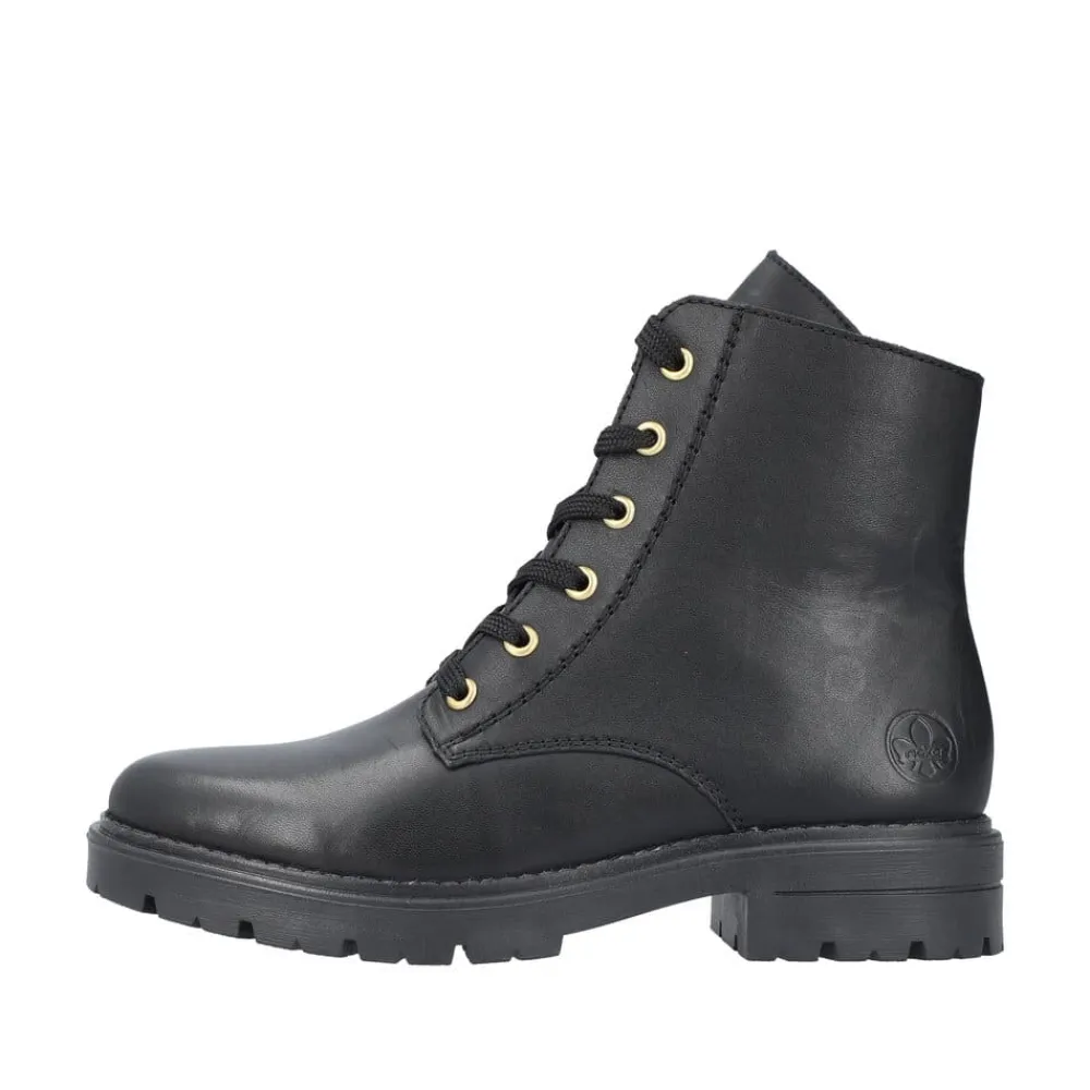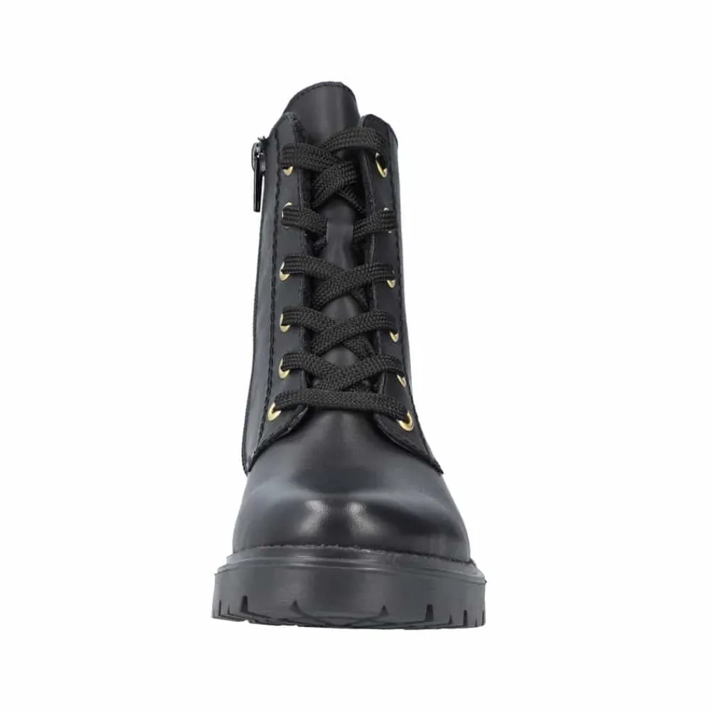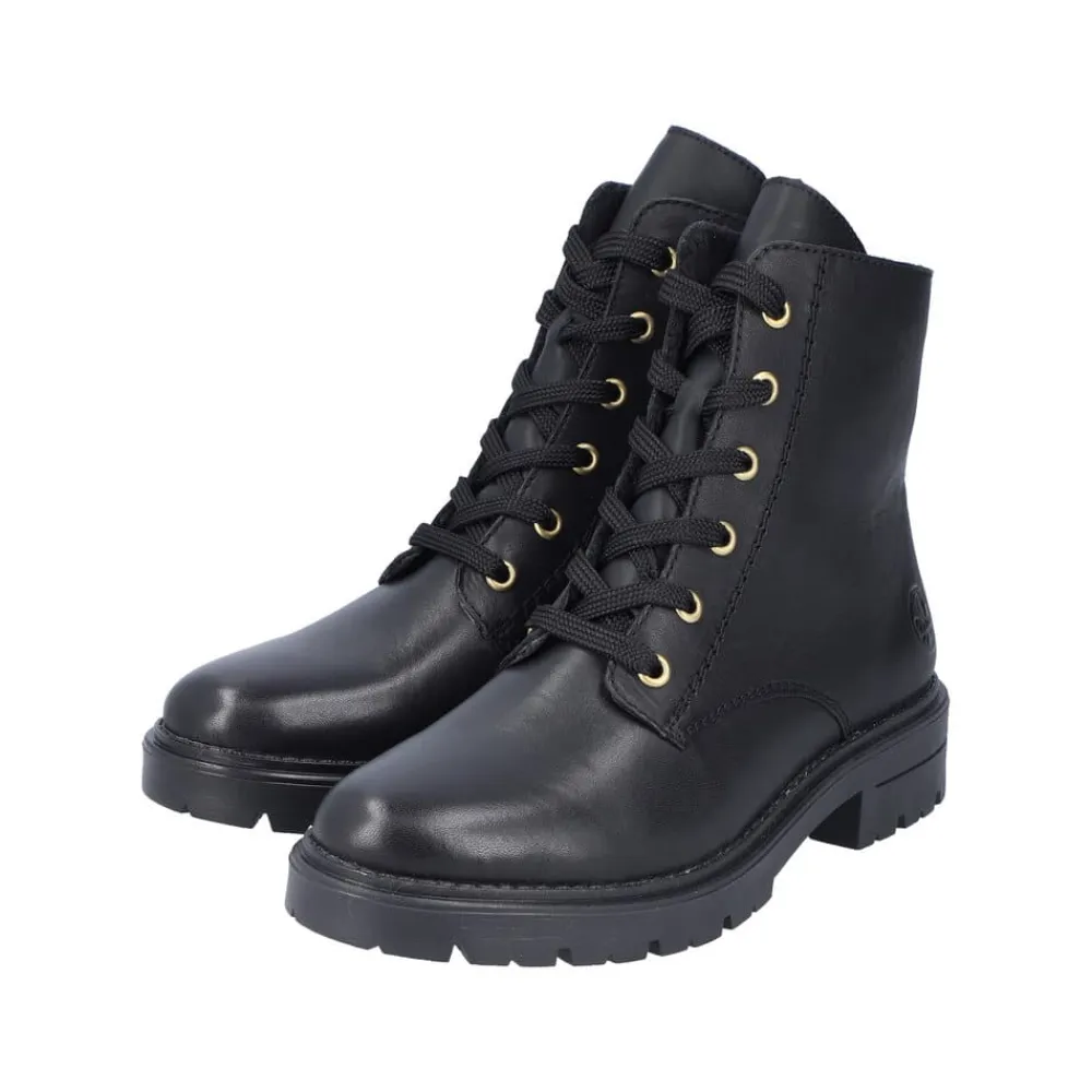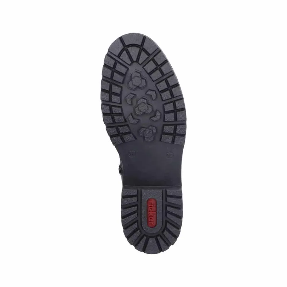 Rieker støvle til dame i sort. Denne sorte støvle i skind kombinerer moderne stil med praktiske detaljer. Støvlen har både snørebånd og en funktionel lynlås, der gør det nemt at tage den af og på, samtidig med at du kan tilpasse pasformen til din fod. Indvendigt sørger en let foring og en blød sål for behagelig komfort hele dagen. Ydersålen er mønstret og stødabsorberende, hvilket giver øget støtte og skridsikkerhed.