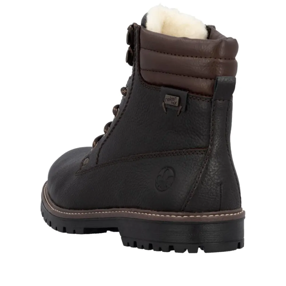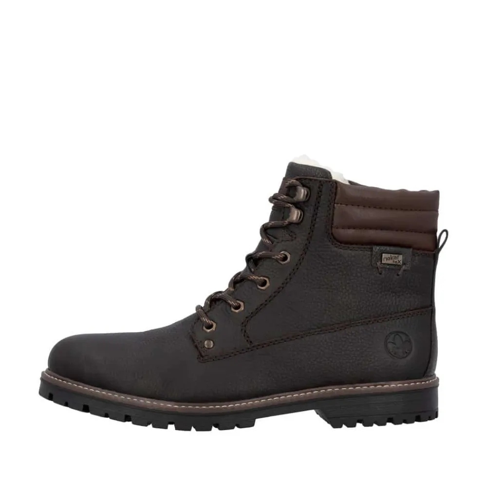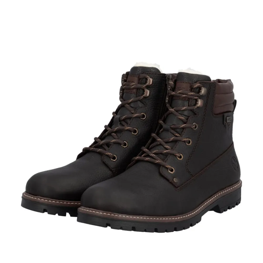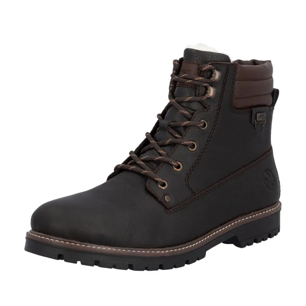Rieker støvle til herre i mørkebrun. En flot mørkebrun vinterstøvle i skind med praktiske og stilfulde detaljer. Snørebåndene foran giver mulighed for at justere pasformen, og lynlåsen på indersiden gør støvlen let at tage på. Indvendigt finder du en varm uldforing og en blød indersål med ekstra bredde G, som sikrer komfort og rummelighed. Rieker-Tex gør støvlen kraftigt vandafvisende, mens den slidstærke ydersål med stødabsorbering og mønster giver øget skridsikkerhed og støtte på vinterens underlag.