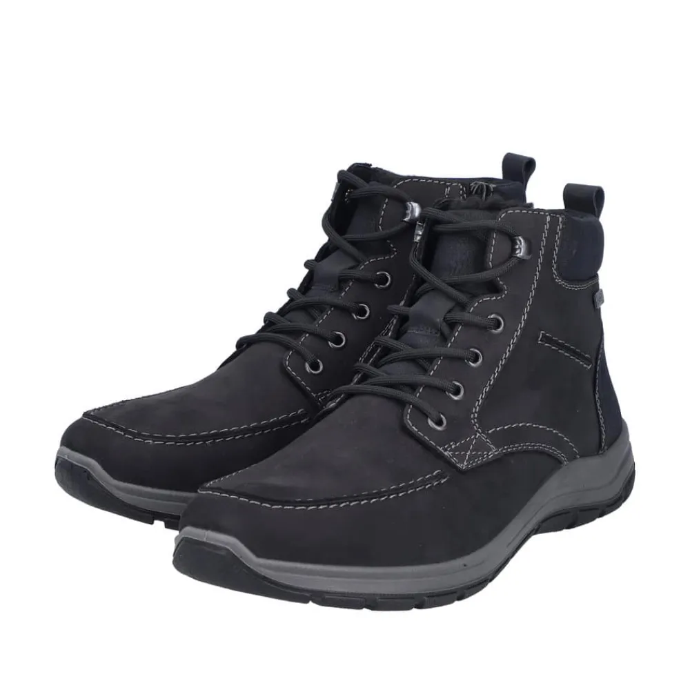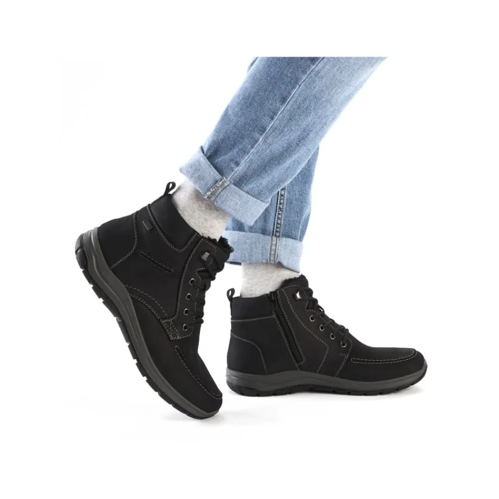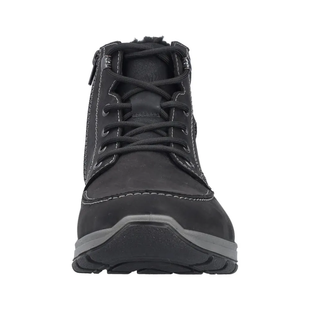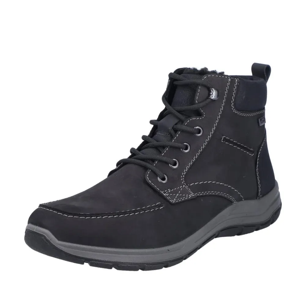 Rieker vinterstøvle til herre i sort. Snørestøvler til herrer fremstillet med en overdel i ægte ruskind. Støvlerne byder på et klassisk design kombineret med fremragende komfort. Den praktiske kombination af snørebånd og lynlås sikrer en perfekt pasform og gør det nemt at tage støvlerne af og på. Den lette og stødabsorberende sål giver dine fødder maksimal komfort hele dagen. Med en polstret og udtagelig indersål føles hvert skridt som ren forkælelse. Den ekstra brede pasform (H) giver rigelig plads til tæerne, mens den vandafvisende RiekerTEX-membran beskytter mod vind og vejr. Det bløde, varme foer holder fødderne behageligt lune, selv på kolde vinterdage. Perfekt til at kombinere funktionalitet og elegance i vinterens udfordringer.