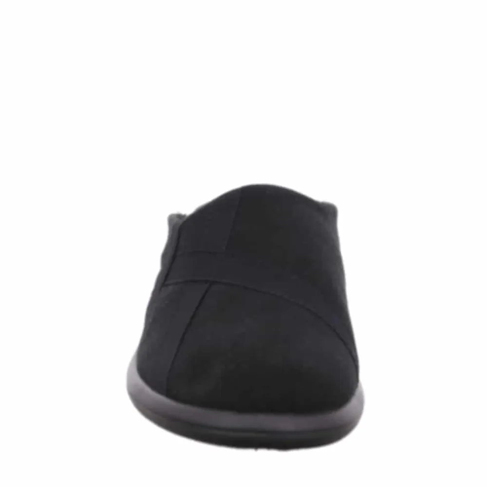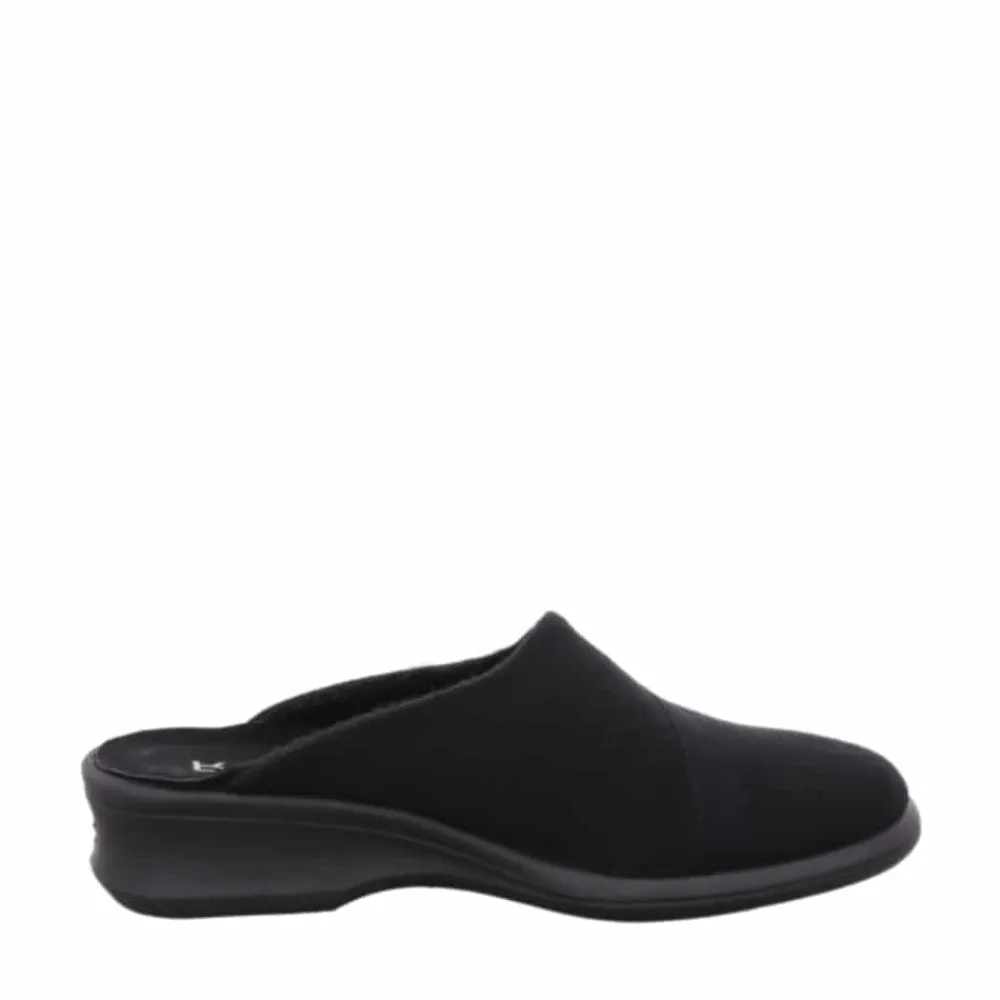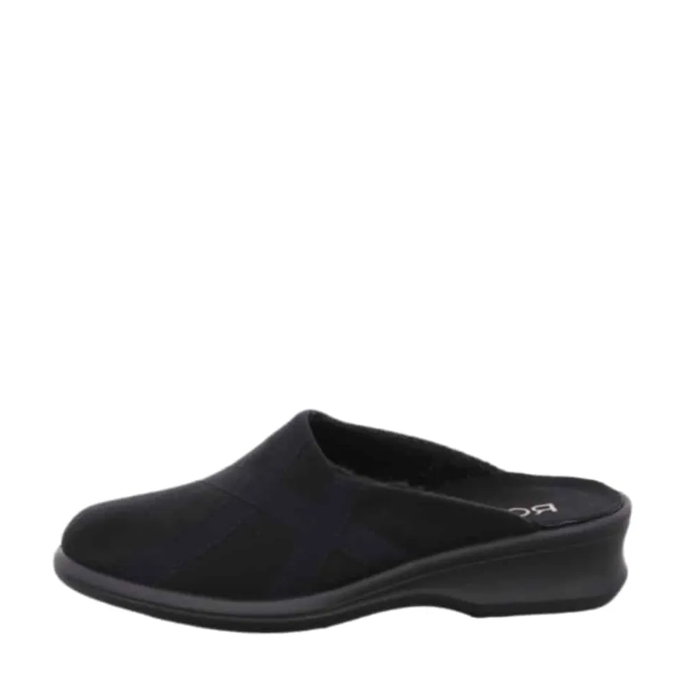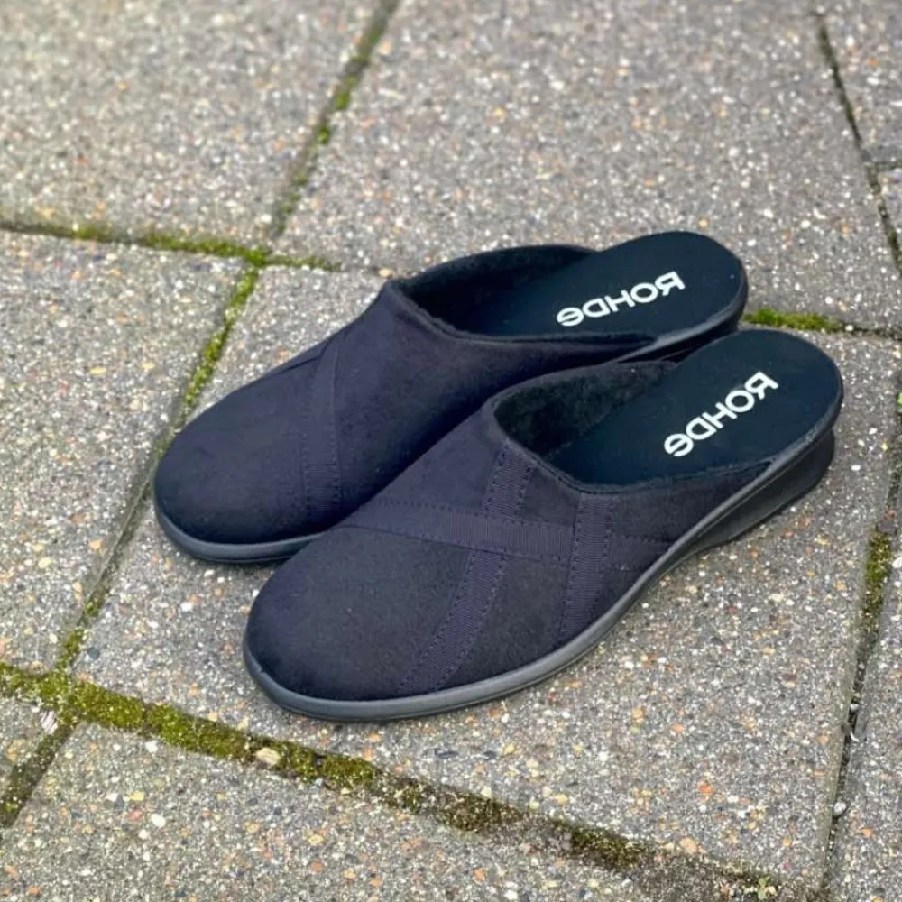 Rohde hjemmesko til dame i sort. Disse hjemmesko er både lette og moderne i en elegant sort farve med fine detaljer. De er fremstillet af blødt materiale og har en ekstra pude ved hælen, der sikrer maksimal komfort. Den solide sål gør dem perfekte til dagligdags brug derhjemme. En hjemmesko, der tilbyder en fantastisk pasform og høj komfort!