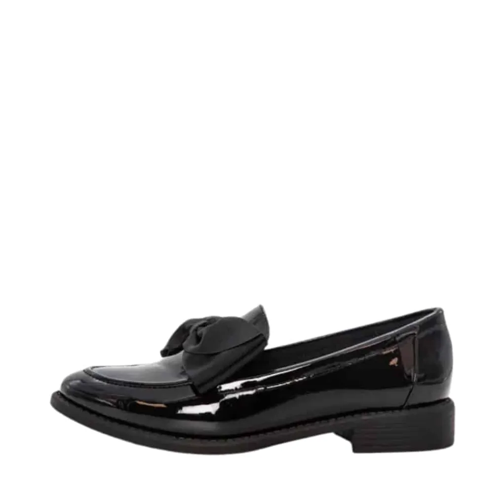 Duffy Francica Sette loafers til dame i sort lak. Disse loafers til dame kombinerer sort lakoverdel med en elegant sløjfe detalje for et feminint udtryk. Skoen er praktisk i hverdagen og let at komme i og af, samtidig med at den kan bruges til pænere lejligheder. Indvendigt finder du en blød indersål, der giver god komfort dagen lang. Den lille hæl på ca. 3 cm giver et diskret løft og bidrager til stabil støtte.