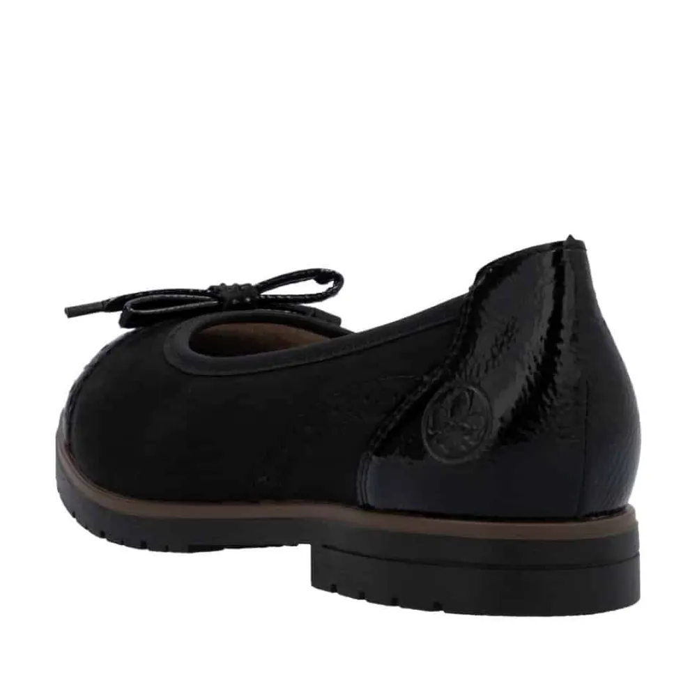 Rieker ballerinasko til dame i sort. Denne moderne ballerinasko i klassisk sort er et perfekt valg til dig, der søger stil og komfort. De flotte lakdetaljer og den elegante sløjfe foran giver skoen et feminint og sofistikeret look. Indvendigt er skoen udstyret med en blød skind indersål, der sikrer maksimal komfort. Den lidt grove sål tilføjer et råt twist til det elegante design og giver ekstra skridsikkerhed og støtte takket være dens stødabsorberende egenskaber.