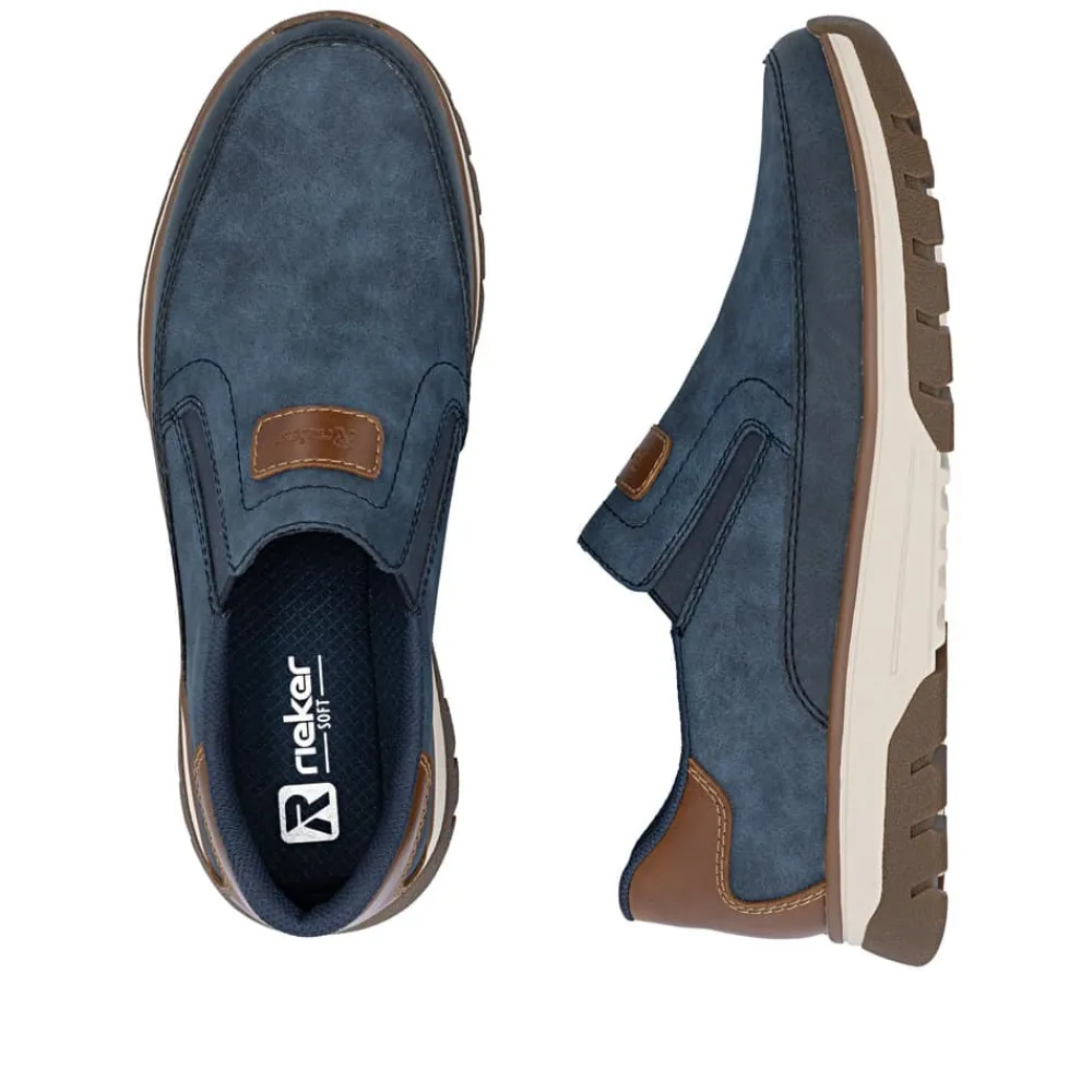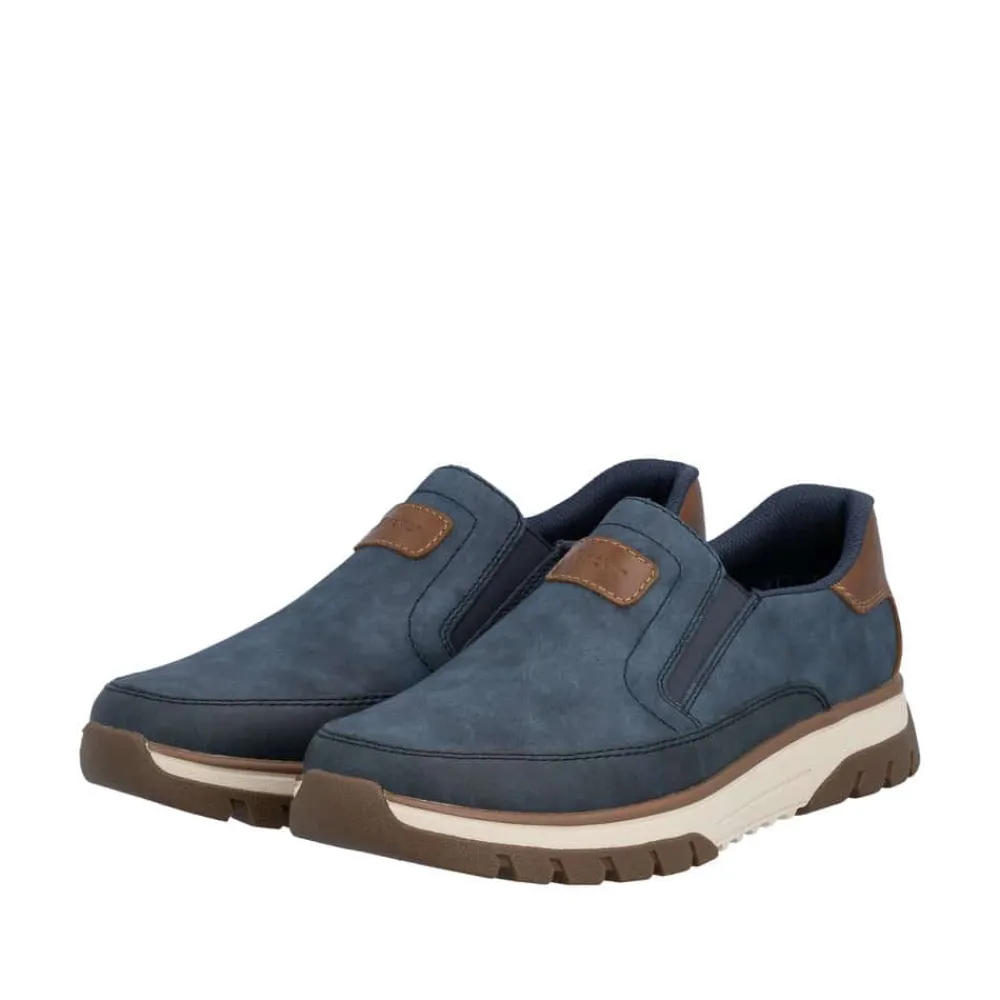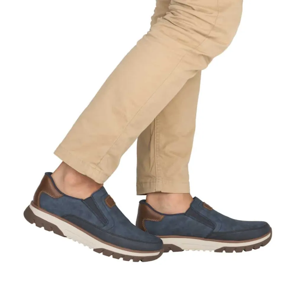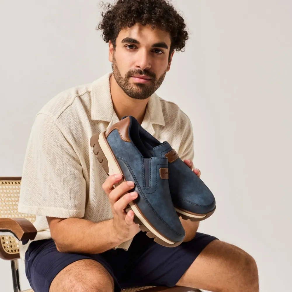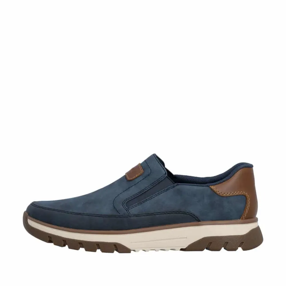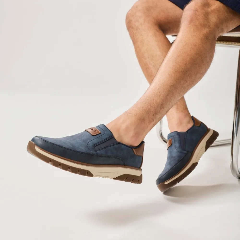 Rieker hyttesko herre i blå. Stilfulde og komfortable sko i et praktisk design, hvor pasform og komfort er i fokus. Elastikken ved åbningen gør at du nemt kan komme i skoen. Indvendigt finder du en blød udtagelig indersål, som giver behagelig komfort hele dagen. Med ekstra bredde (H) får du god rummelighed til foden, så skoen føles behagelig at bruge. Den mønstrede ydersål giver øget støtte og skridsikkerhed.