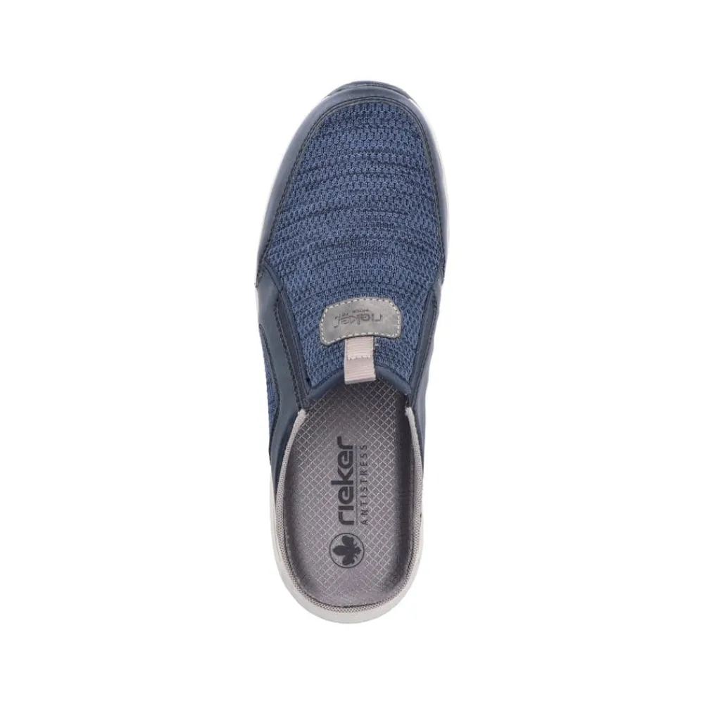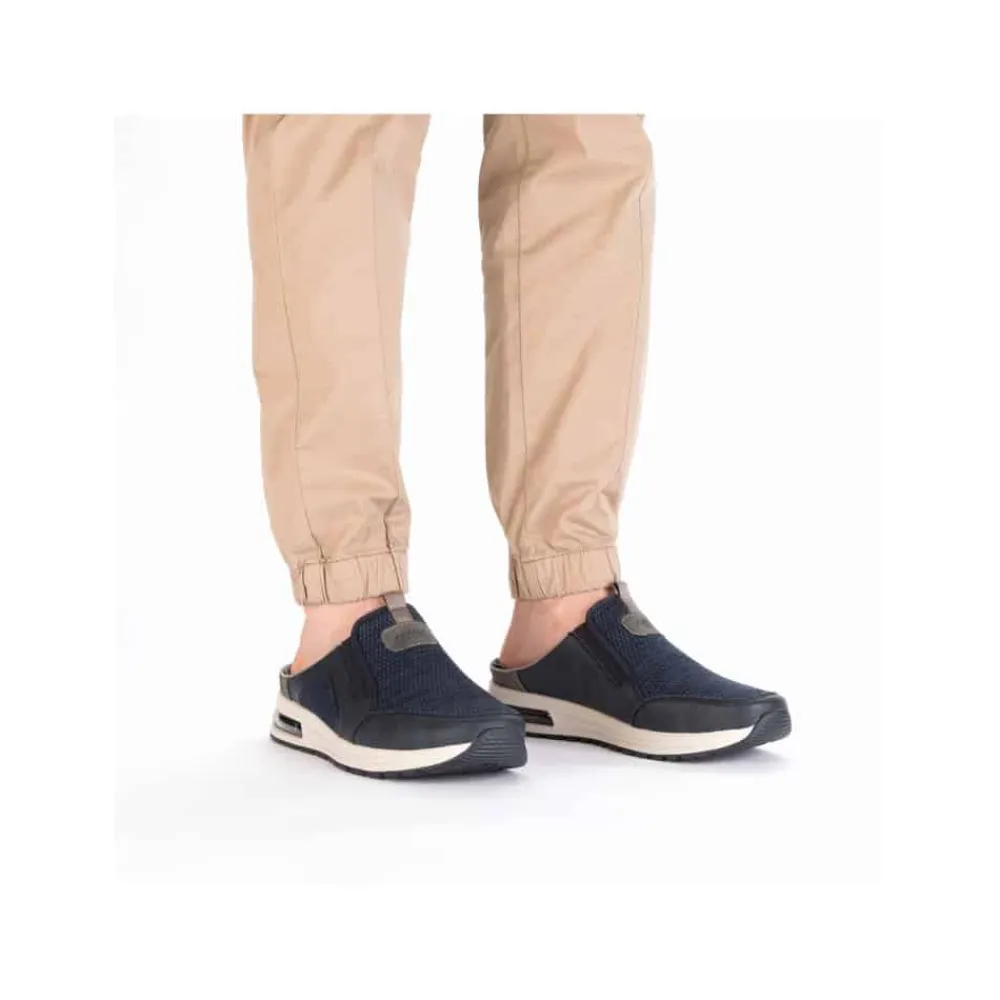 Rieker hyttesko til herre i blå. Funktionel og stilfuld. Denne blå Rieker-hyttesko til mænd med elastisk indlæg gør på- og aftagning af sandalen hurtig og nem. Med den lette, stødabsorberende sål og den polstrede, udtagelige indersål får du den bedste komfort hele dagen. Den komfortvidde G giver ekstra plads til bredere fødder, mens Rieker Air i hælen tilføjer både et moderne look og en blød stødabsorbering.