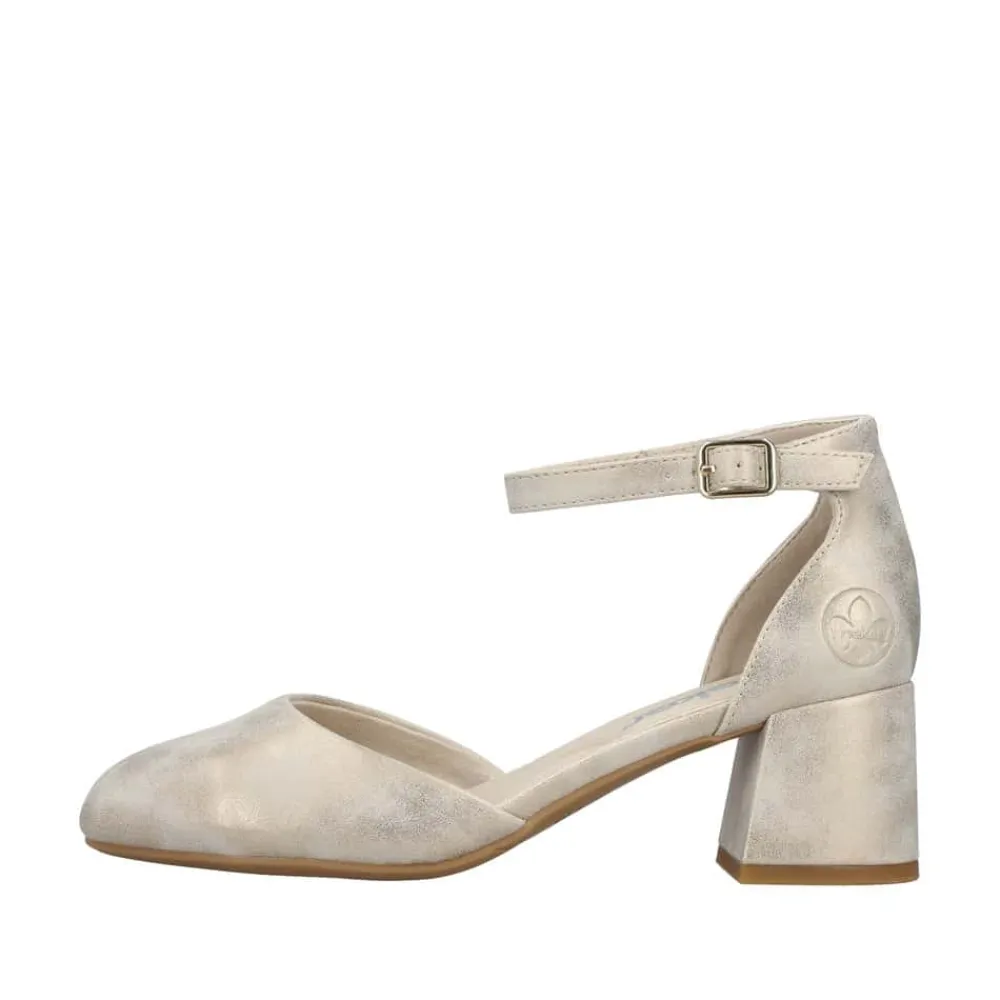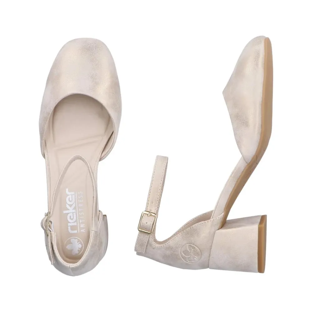 Rieker pumps til dame i metallic guld. Disse moderne pumps forener komfort med et stilfuldt udtryk og er et oplagt valg til både hverdag og finere anledninger. Skoen er udstyret med et elegant spænde, som giver en flot detalje og samtidig gør skoen nem at tage af og på. Indvendigt mødes du af en blød indersål, der sikrer behagelig komfort dagen lang. Blokhælen på 5,5 cm giver et flot og elegant løft uden at gå på kompromis med komforten.