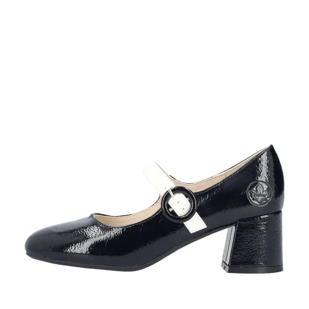Rieker pumps til dame i sort lak. Moderne pumps i en smuk sort farve med en blank lakoverdel og en hvid rem over forfoden, som giver skoen et elegant og stilfuldt look. Den praktiske spændelukning gør det nemt at tage skoen af og på. Indvendigt finder du en blød indersål i skind, der sikrer komfort hele dagen. Den stabile blokhæl på cirka 6 cm giver et feminint løft, mens den stødabsorberende sål sørger for en behagelig gang.