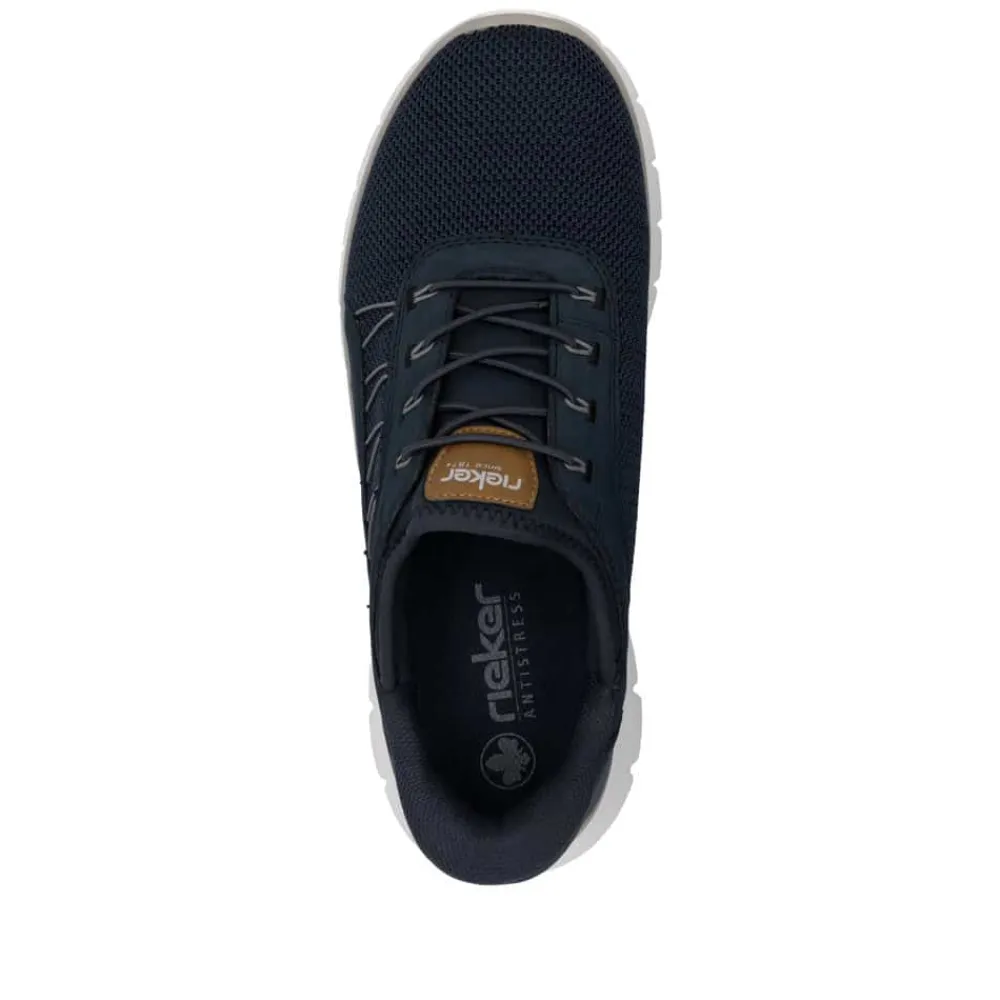 Rieker Ready 2 Go sneakers til herre i blå. Denne Rieker sneakers er udstyret med den praktiske Hands Free Ready 2 Go-teknologi, som gør det nemt at tage skoen på uden at bruge hænderne, takket være den solide hælkappe. Med Rieker-Lite er skoen utrolig let og udstyret med Rieker Antistress, der sikrer optimal fleksibilitet og stødabsorbering. Den elastiske åbning tilpasser sig foden for maksimal komfort.