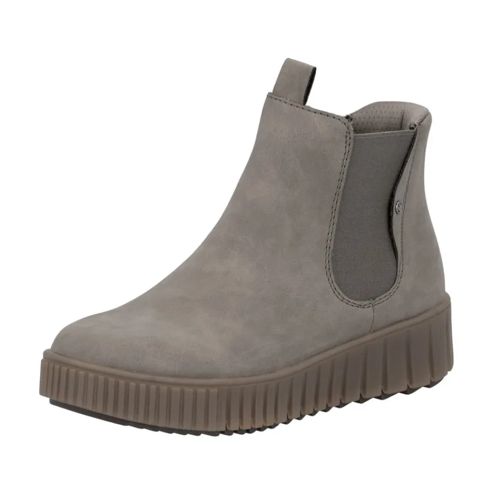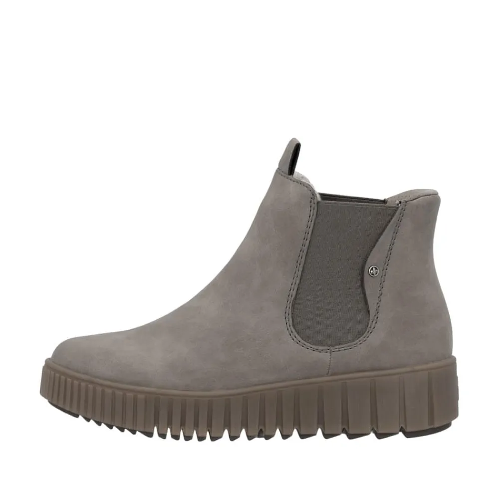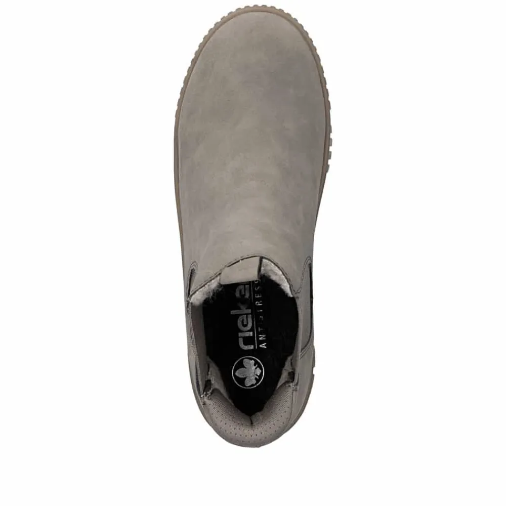 Rieker Ready 2 Go støvle til dame i grå. Flot grå støvle, perfekt til dig der ønsker både stil og komfort. Med Ready 2 Go teknologien og en fast hælkappe kan støvlen tages på uden brug af hænder. Indvendigt finder du en varm foring og en blød udtagelig sål, som giver behagelig komfort hele dagen. Mens den mønstrede ydersål på 4 cm giver øget stødabsorbering og skridsikkerhed.