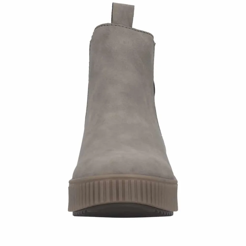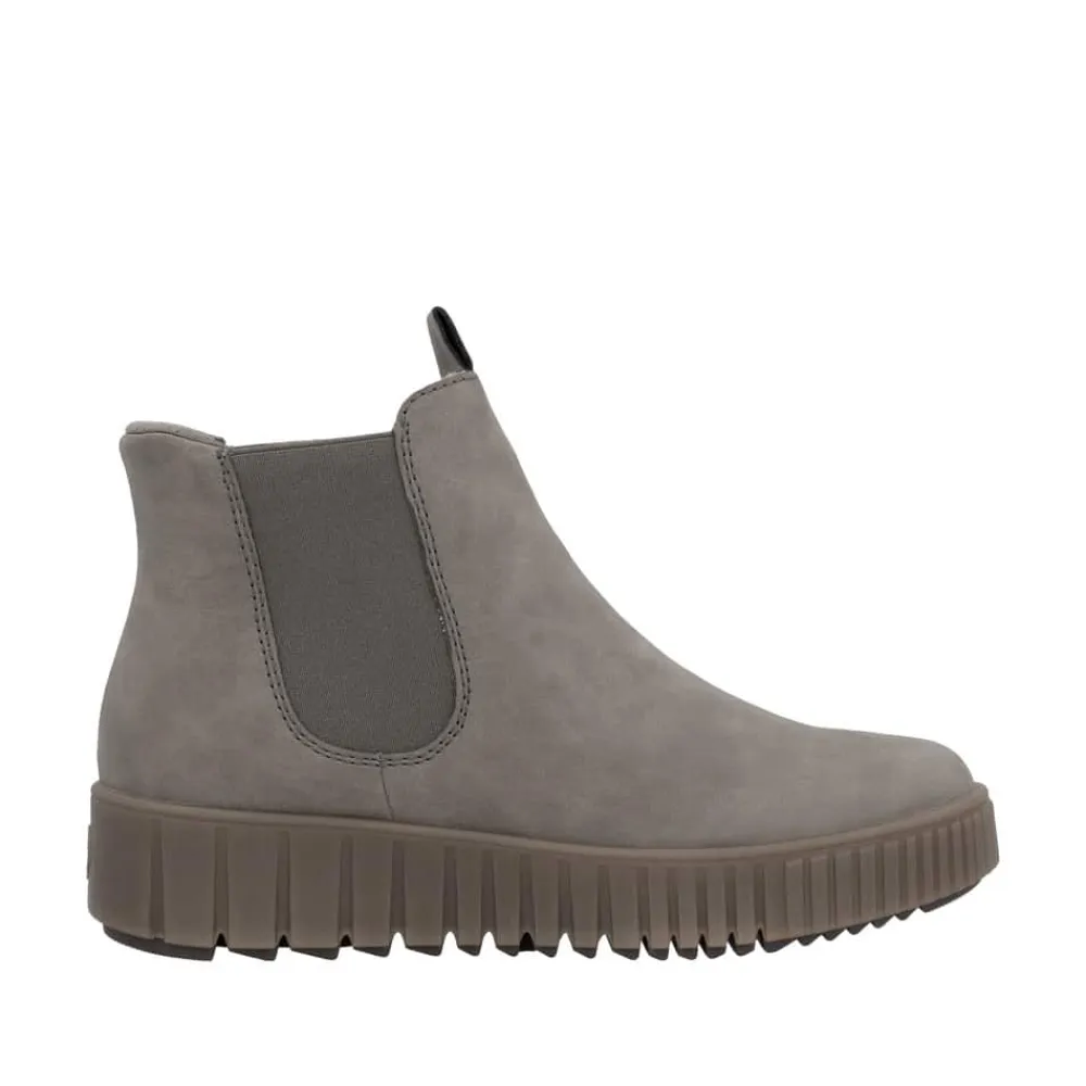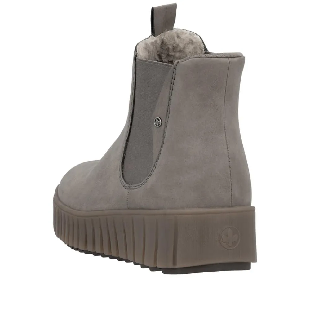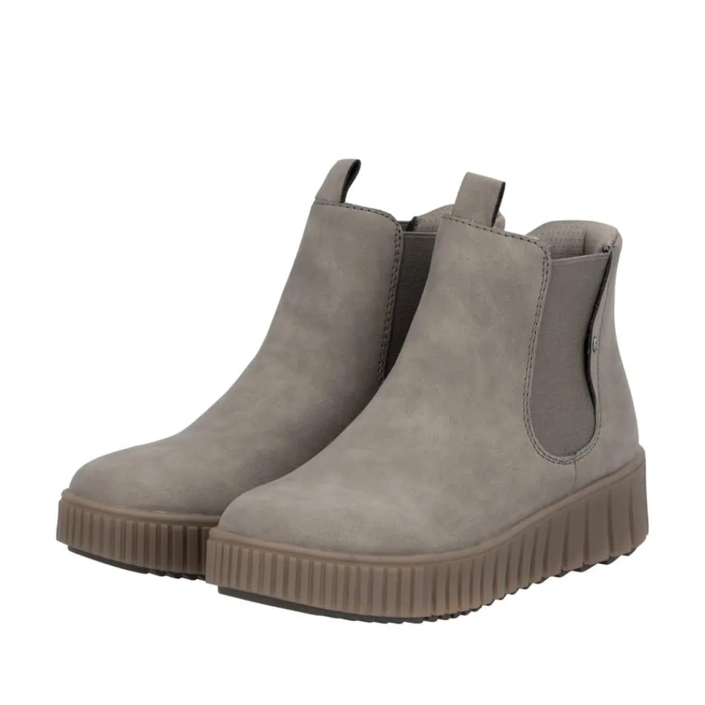 Rieker Ready 2 Go støvle til dame i grå. Flot grå støvle, perfekt til dig der ønsker både stil og komfort. Med Ready 2 Go teknologien og en fast hælkappe kan støvlen tages på uden brug af hænder. Indvendigt finder du en varm foring og en blød udtagelig sål, som giver behagelig komfort hele dagen. Mens den mønstrede ydersål på 4 cm giver øget stødabsorbering og skridsikkerhed.