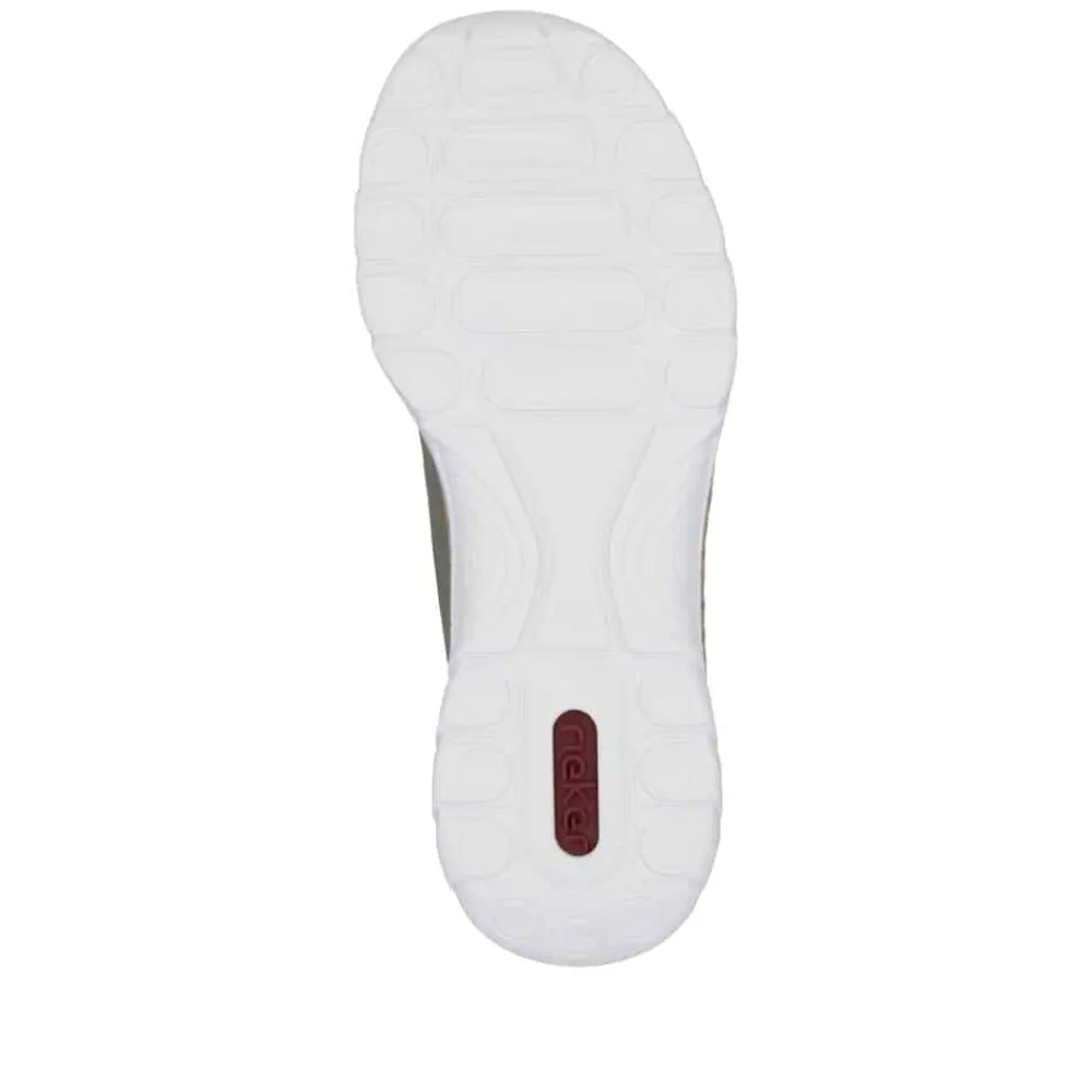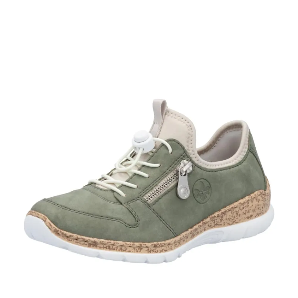 Rieker sneakers til dame i grøn. Smart grøn sko med fokus på komfort og funktion i hverdagen. Den elastiske lukning gør det let at tage skoen af og på og sikrer en behagelig pasform. Indvendigt har skoen en blød Memosoft indersål, som former sig efter foden og giver god komfort gennem dagen. Den stødabsorberende ydersål er designet med mønster, der giver stabil støtte og øget skridsikkerhed.