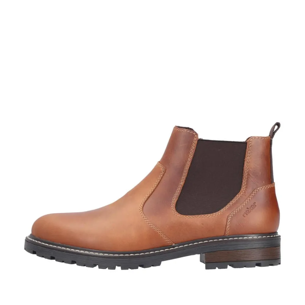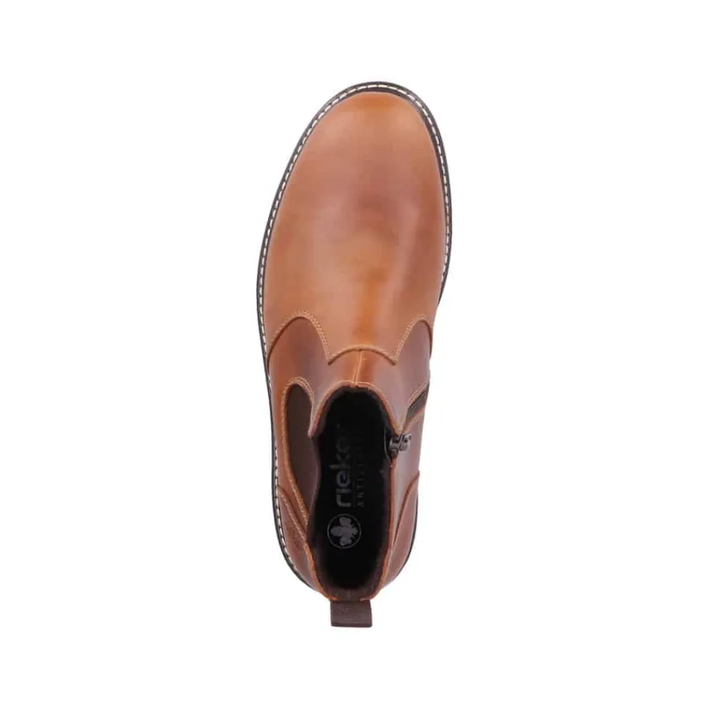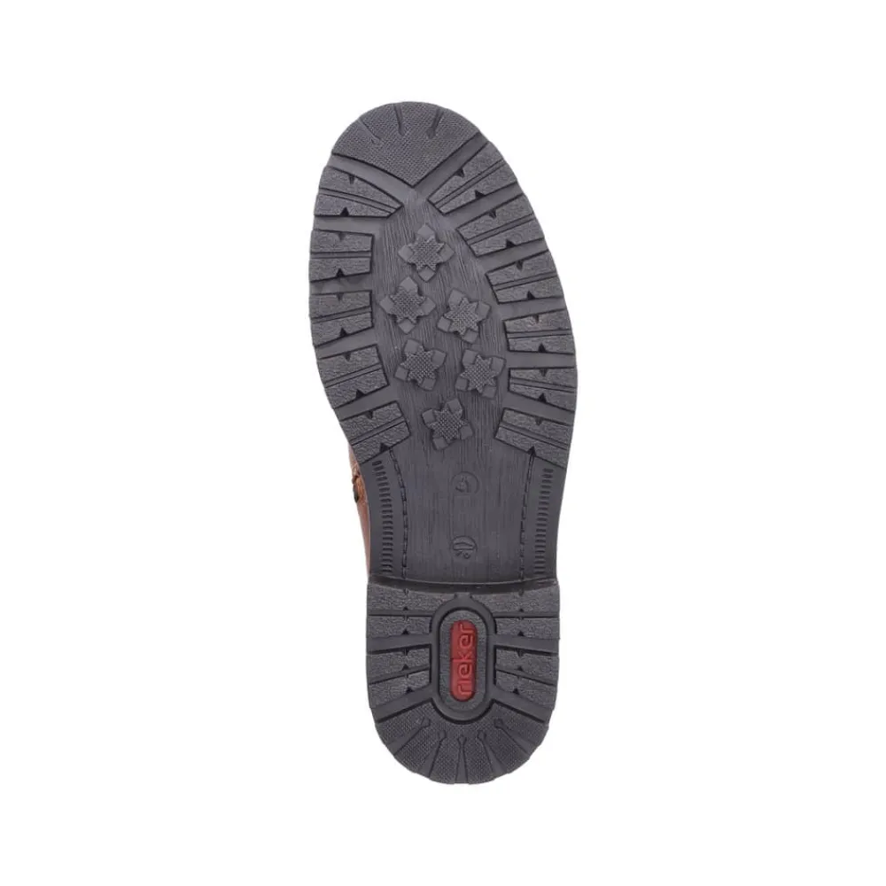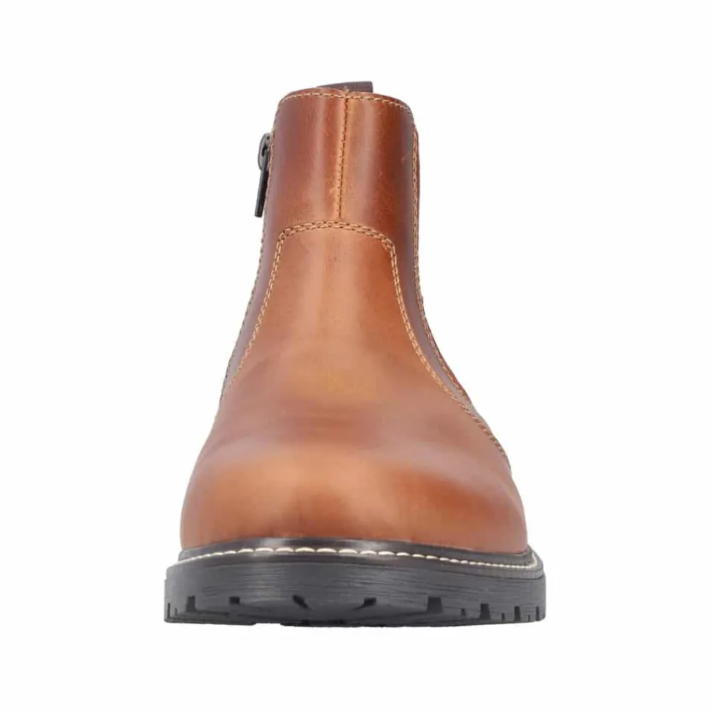 Rieker støvle til herre i brun. Flot herrestøvle i skind, der giver både komfort og en god pasform. Modellen er udstyret med en funktionel lynlås og elastik, som gør det nemt at tage støvlen af og på. Indvendigt finder du en blød sål og en let foring, mens den ekstra bredde (G) giver mere plads og fleksibilitet. Ydersålen har et mønster, der øger både stødabsorbering og skridsikkerhed.
