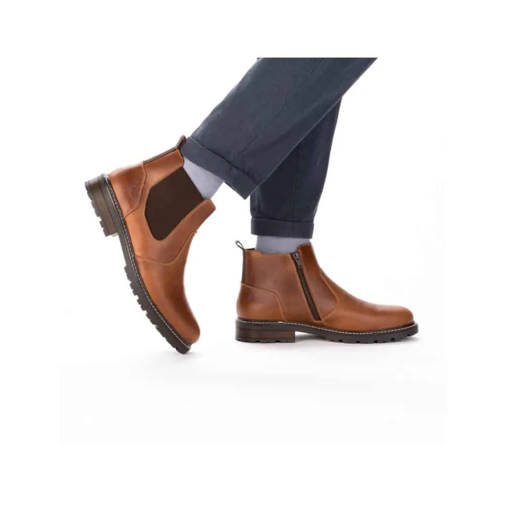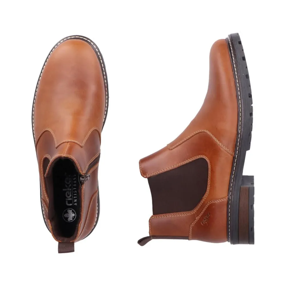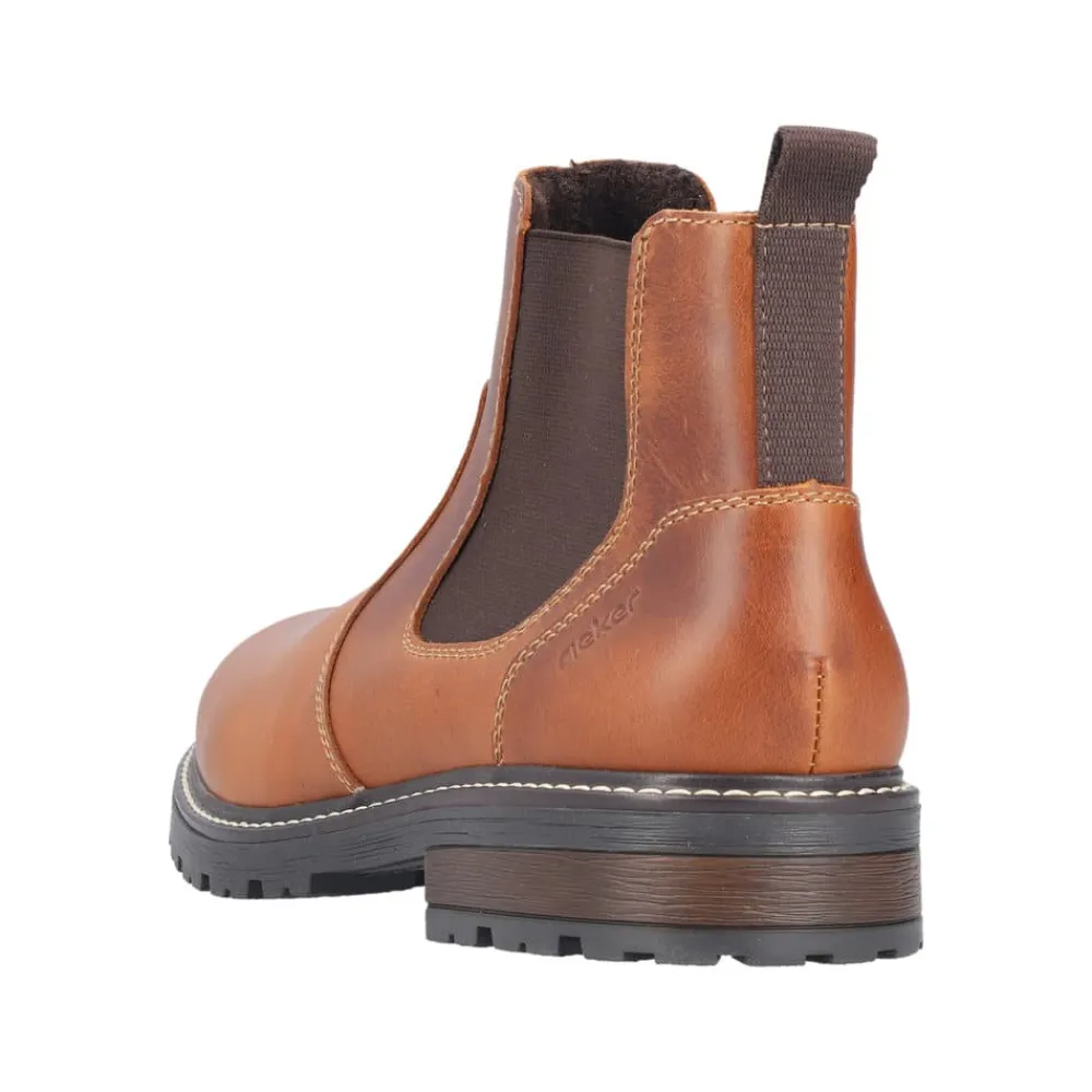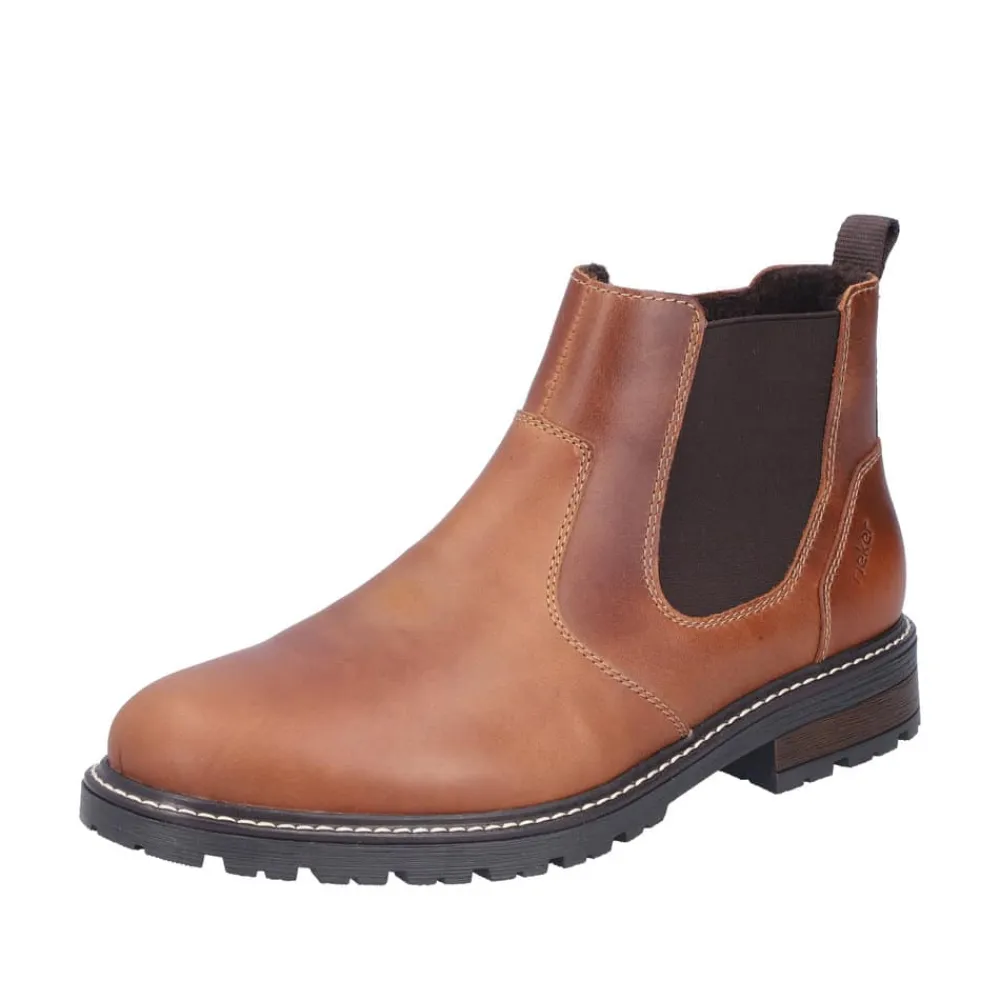Rieker støvle til herre i brun. Flot herrestøvle i skind, der giver både komfort og en god pasform. Modellen er udstyret med en funktionel lynlås og elastik, som gør det nemt at tage støvlen af og på. Indvendigt finder du en blød sål og en let foring, mens den ekstra bredde (G) giver mere plads og fleksibilitet. Ydersålen har et mønster, der øger både stødabsorbering og skridsikkerhed.