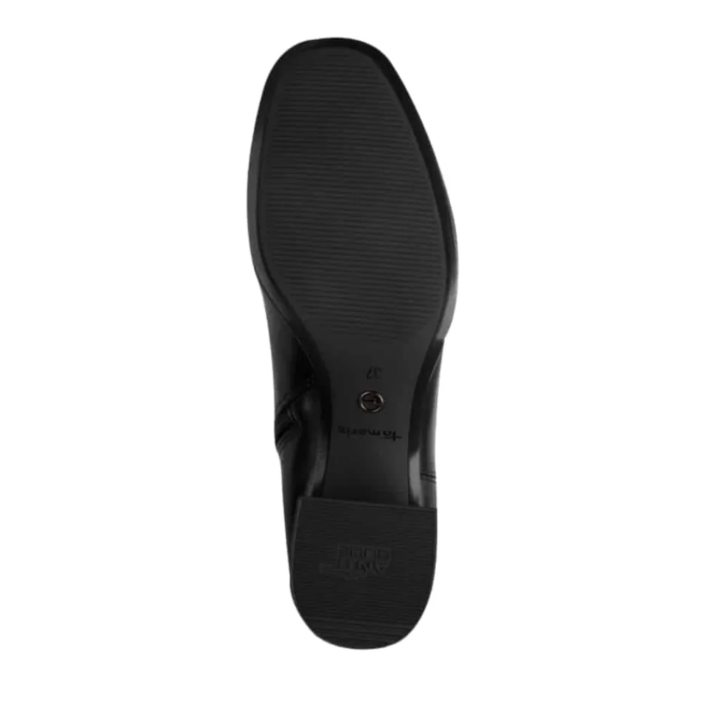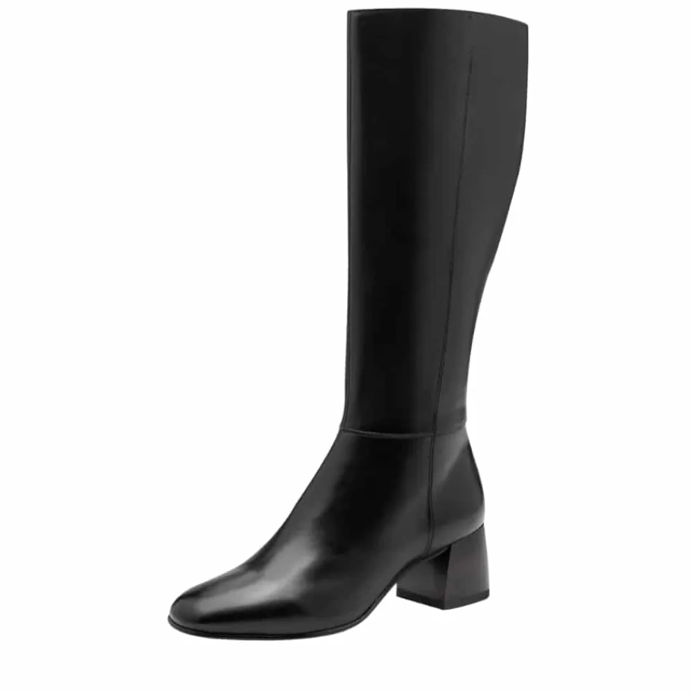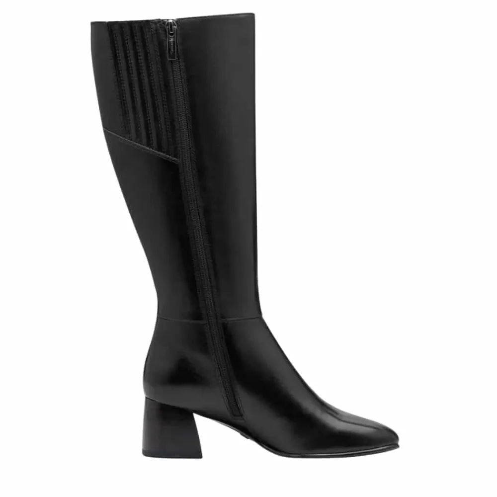 Tamaris lang støvle til dame i sort. Denne klassiske sorte støvle med langt skaft kombinerer enkelthed med et moderne udtryk. Overdelen er fremstillet i blødt skind og den funktionelle lynlås på indersiden samt elastikken sikrer en fleksibel pasform og gør støvlen let at tage af og på. Indvendigt er den udstyret med en blød indersål med Touch It teknologi, som former sig efter foden. Blokhælen på ca 6 cm er designet med Anti Slide og Anti Shock, der giver øget komfort og skridsikkerhed.