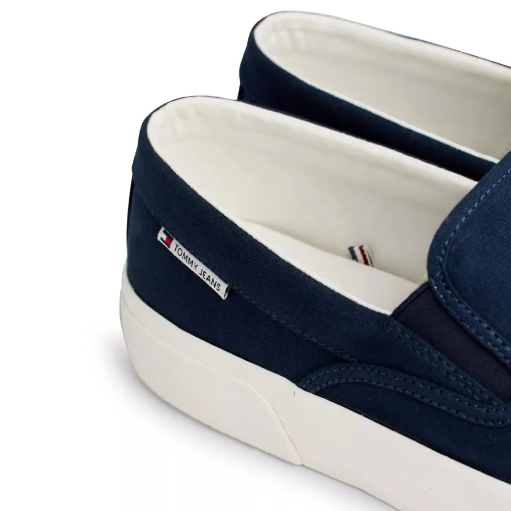 Tommy Jeans sko i mørkeblå til herre. Slip in sko fra Tommy Jeans i en elegant mørkeblå farve. Skoens ydersål er udfærdiget i naturgummi, der sikrer solidt fodfæste. Modellen er let at glide i, takket være den smarte designløsning med elastik i siderne, hvilket gør dem ideelle til travle dage. For optimal komfort er modellen udstyret med udtagelige såler, der giver dig mulighed for at tilpasse skoene efter dine egne præferencer eller erstatte sålerne, når det er nødvendigt.
