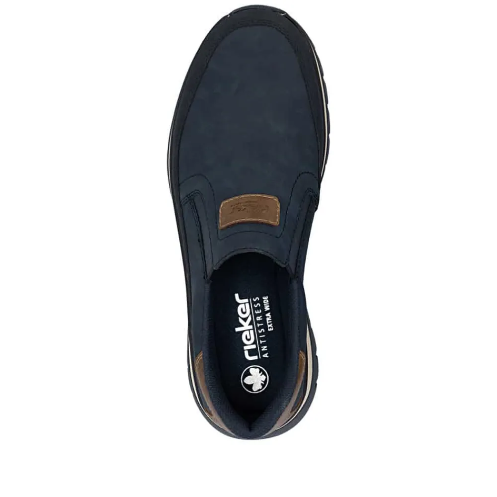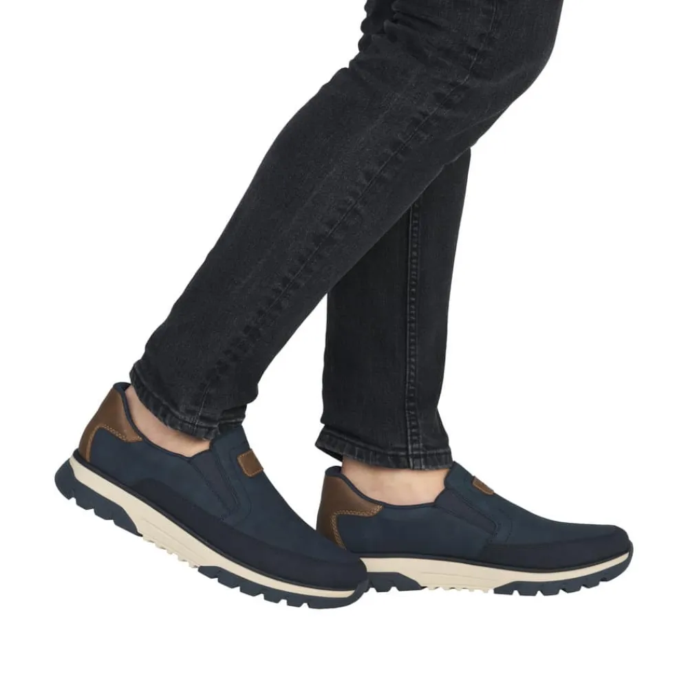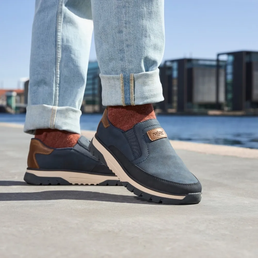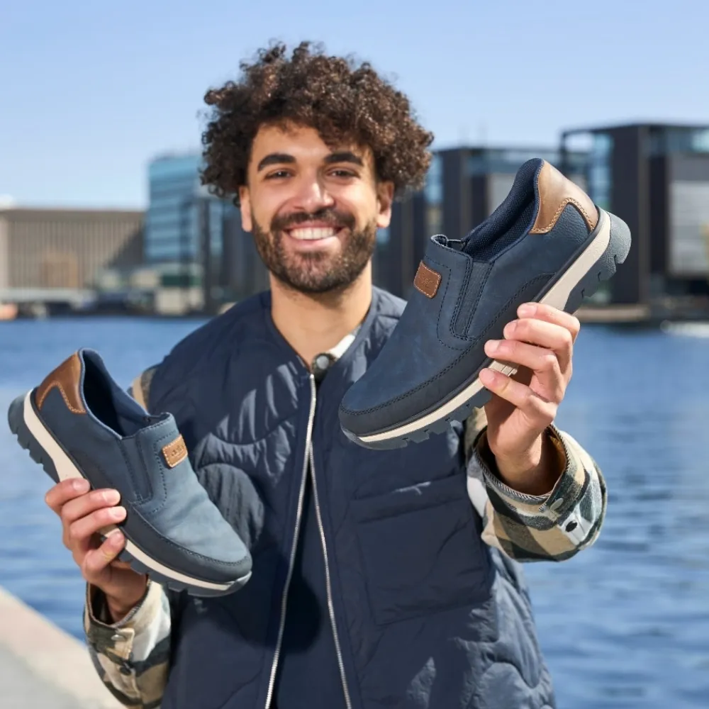 Rieker hyttesko til herre i blå. Disse blå Rieker hyttesko kombinerer stil og komfort i ét design. Skoene har elastik ved åbningen, som gør dem lette at tage af og på og giver en god pasform omkring foden. Med Rieker Antistress føles skoene både lette og fleksible, selv efter mange timers brug. Indvendigt finder du en blød og udtagelig sål, som sikrer god komfort hele dagen. Den ekstra bredde (H) giver god plads og bevægelsesfrihed, mens den mønstrede ydersål øger både stødabsorbering og skridsikkerhed.