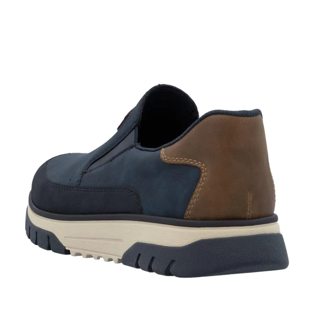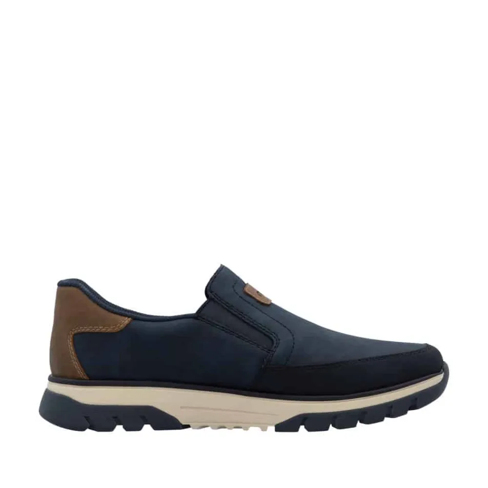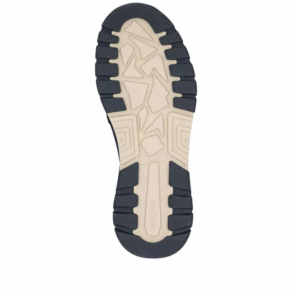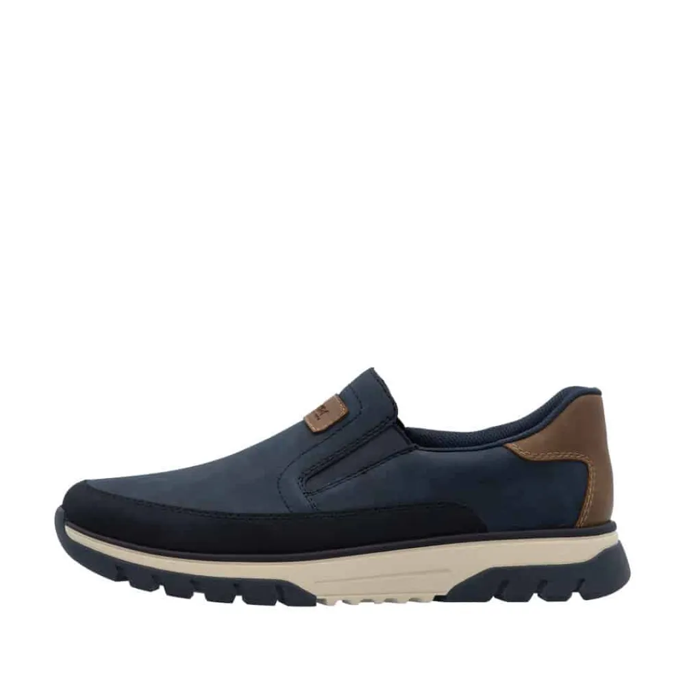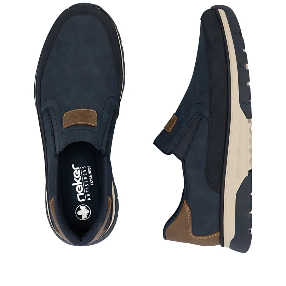 Rieker hyttesko til herre i blå. Disse blå Rieker hyttesko kombinerer stil og komfort i ét design. Skoene har elastik ved åbningen, som gør dem lette at tage af og på og giver en god pasform omkring foden. Med Rieker Antistress føles skoene både lette og fleksible, selv efter mange timers brug. Indvendigt finder du en blød og udtagelig sål, som sikrer god komfort hele dagen. Den ekstra bredde (H) giver god plads og bevægelsesfrihed, mens den mønstrede ydersål øger både stødabsorbering og skridsikkerhed.