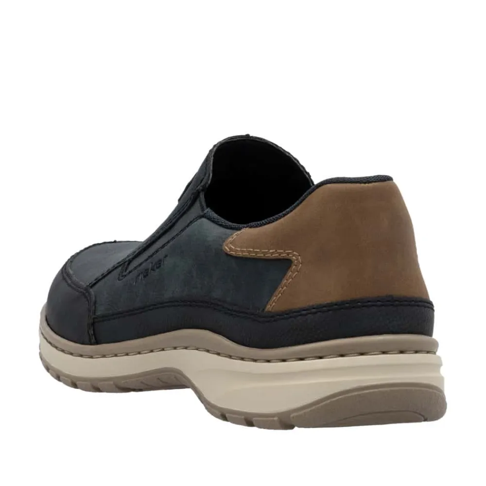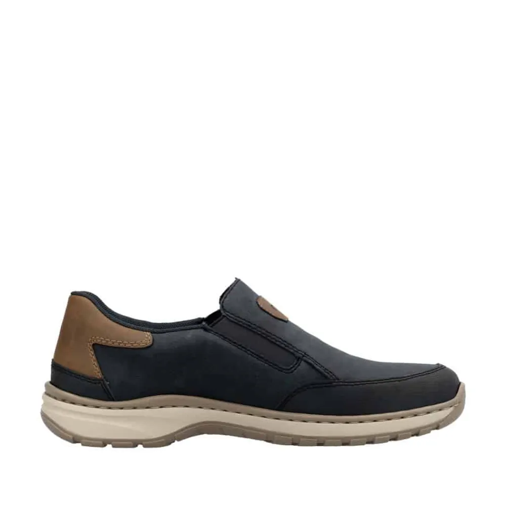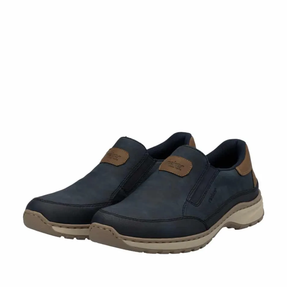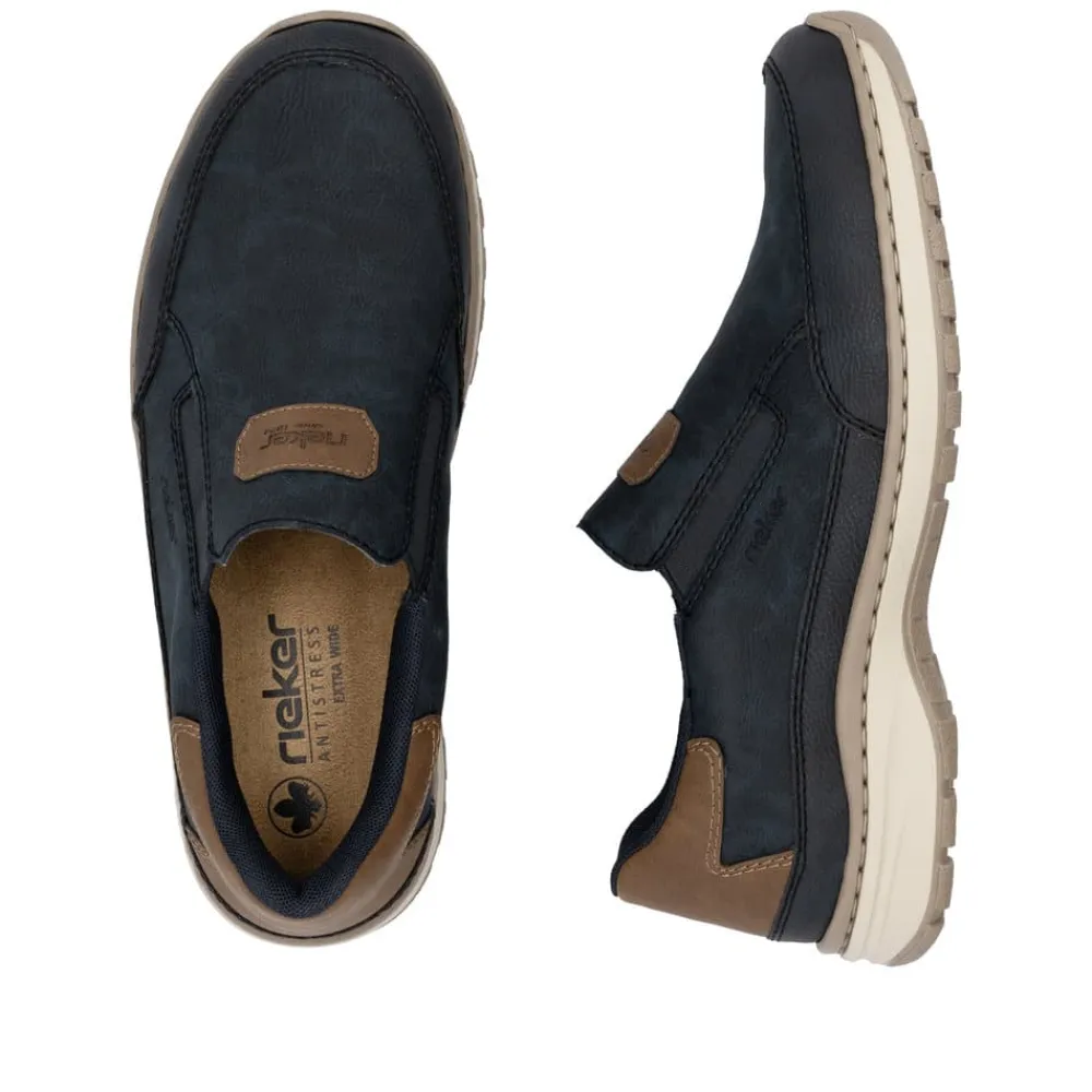 Rieker hyttesko til herre i blå. Disse blå Rieker hyttesko har den perfekte kombination stil og komfort. Den fleksible og slidstærke konstruktion giver en fremragende pasform, mens elastikken ved åbningen gør dem nemme at tage på og tilpasser sig foden. Den lette og stødabsorberende PU-sål sikrer en behagelig gang hele dagen, selv på lange ture. Den udtagelige indersål giver mulighed for personlig tilpasning, og den ekstra brede pasform (H) sørger for god plads til forfoden. En stilfuld og funktionel sko til enhver lejlighed.