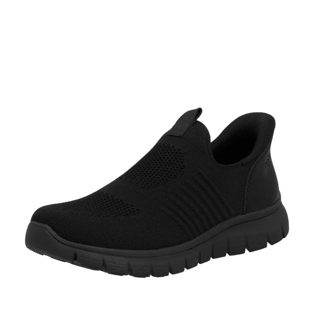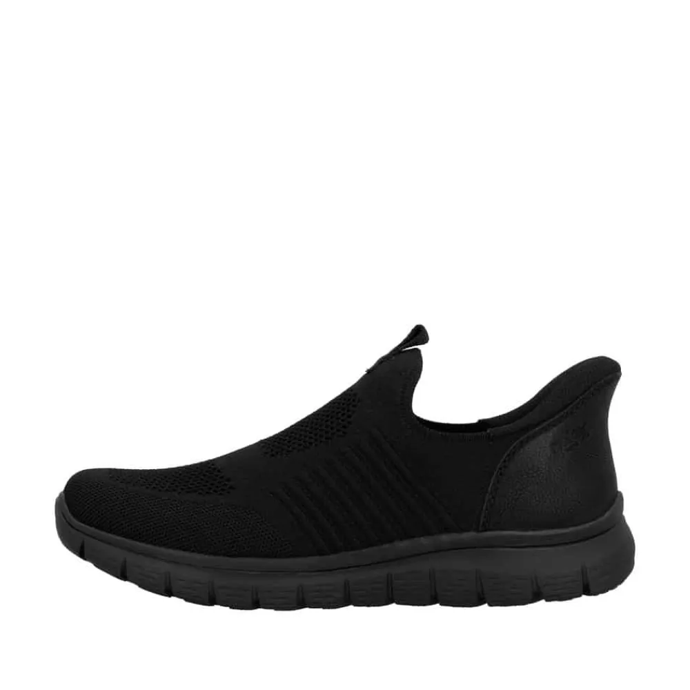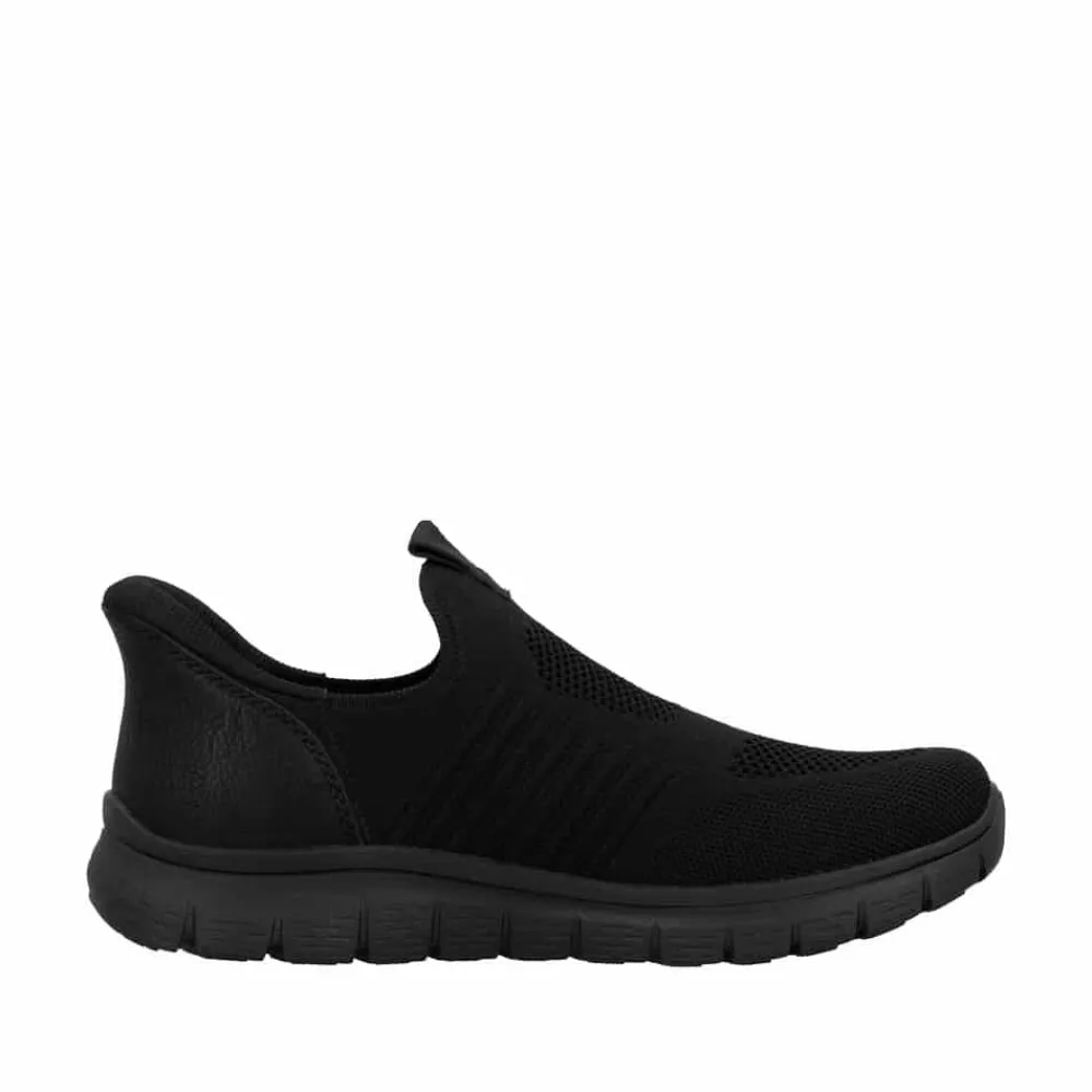 Rieker Ready 2 Go hyttesko til herre i sort. Disse moderne hyttesko er et praktisk valg til dig, der ønsker både stil og funktion. Med Ready 2 Go-teknologien og en fast hælkappe er skoen let at tage på uden brug af hænder, og den brede pasform (G) giver god plads til foden. Den mønstrede ydersål hjælper med at øge støtte og stabilitet i dine skridt.