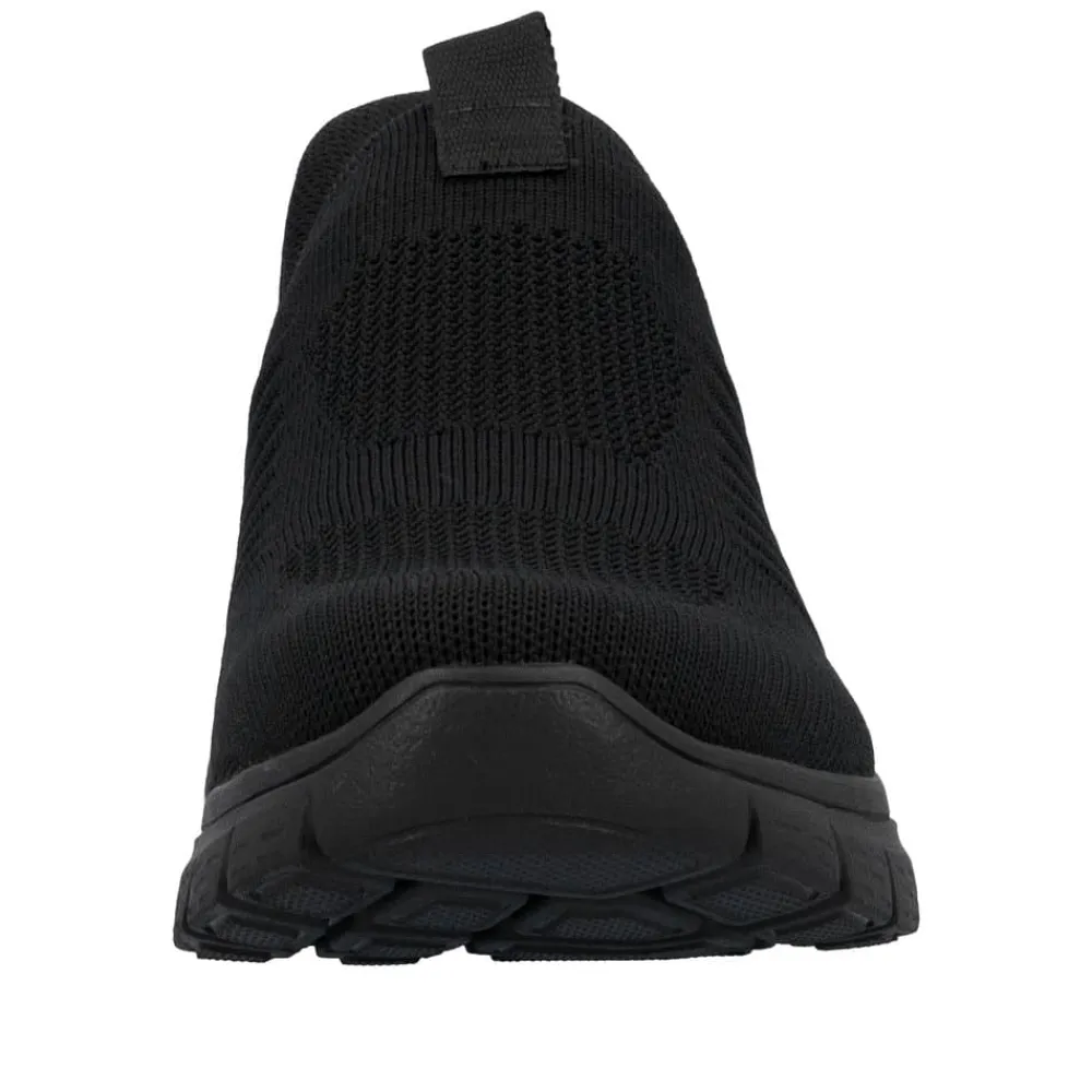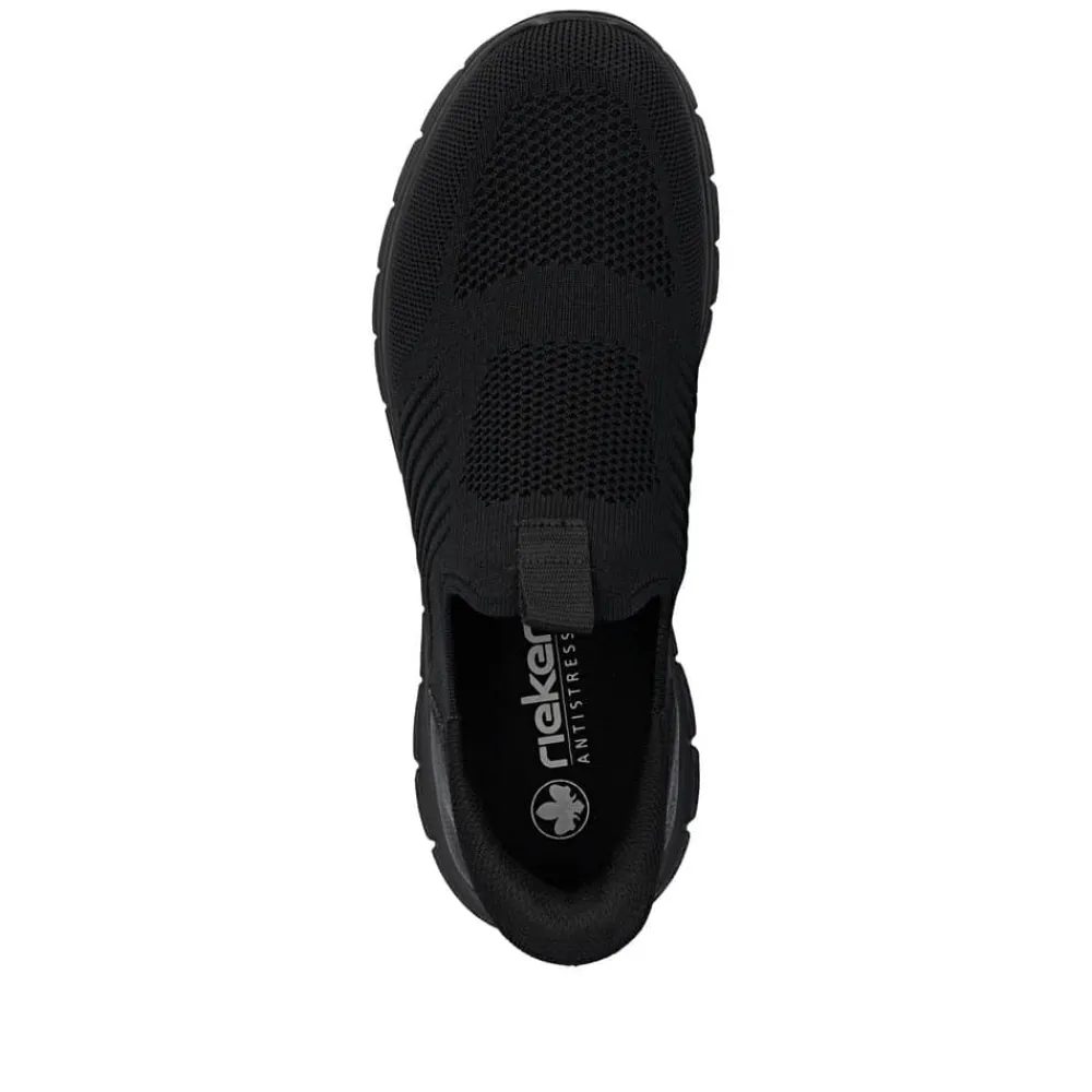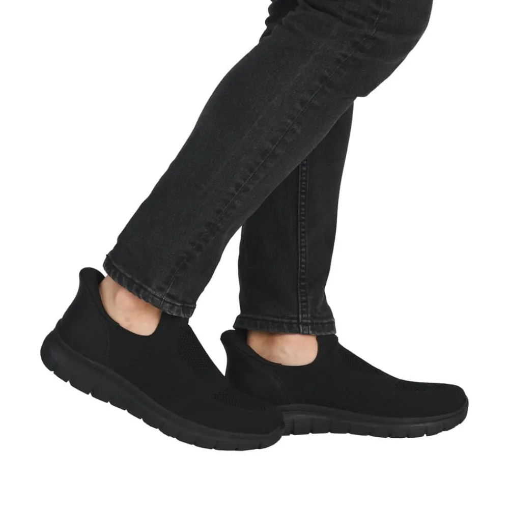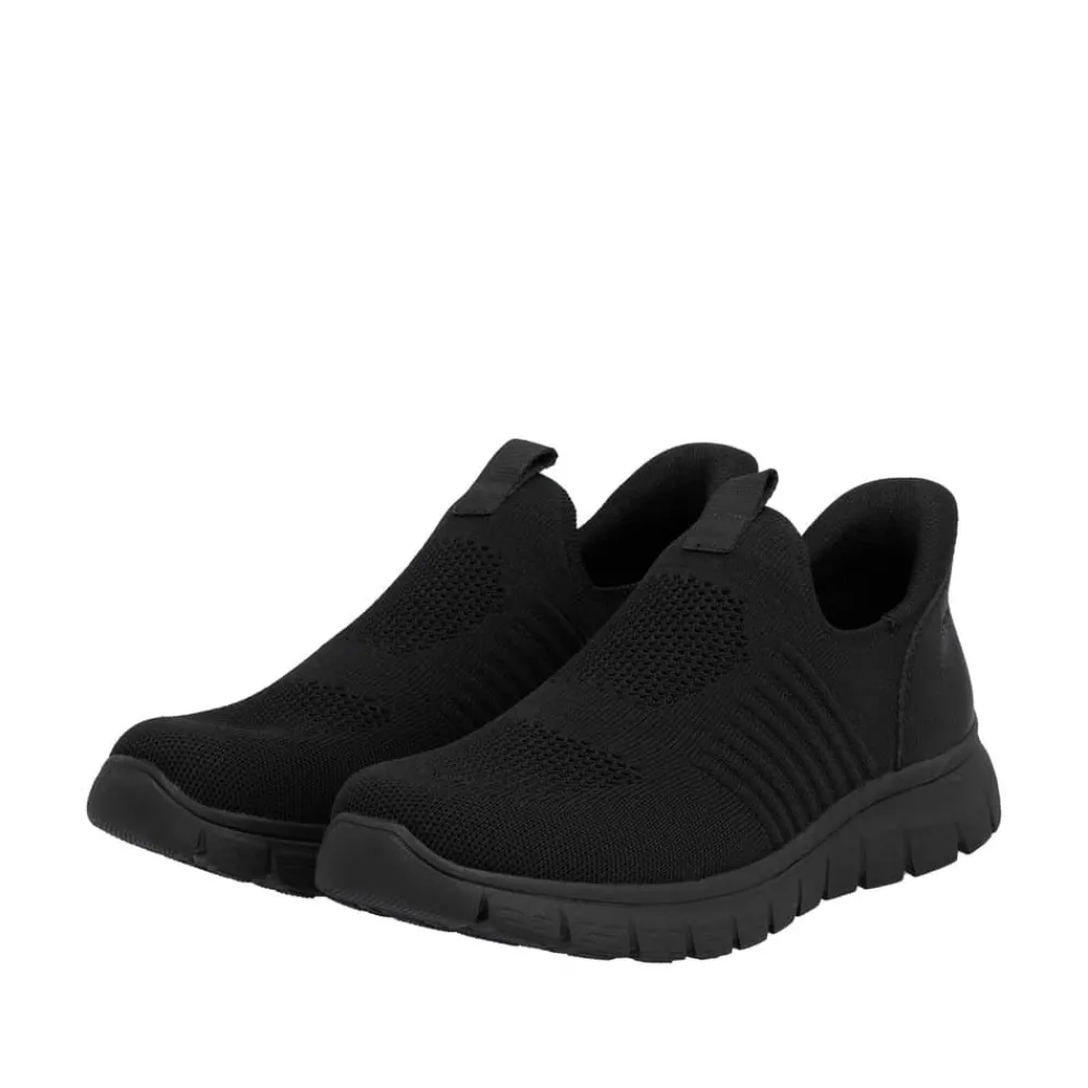 Rieker Ready 2 Go hyttesko til herre i sort. Disse moderne hyttesko er et praktisk valg til dig, der ønsker både stil og funktion. Med Ready 2 Go-teknologien og en fast hælkappe er skoen let at tage på uden brug af hænder, og den brede pasform (G) giver god plads til foden. Den mønstrede ydersål hjælper med at øge støtte og stabilitet i dine skridt.